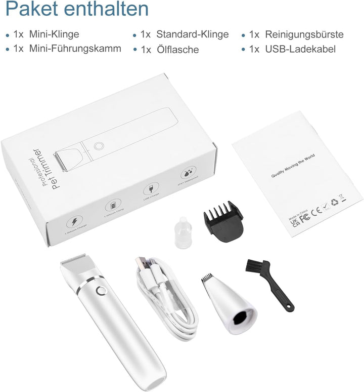 - 🐱🐶【HINWEIS】: Paket enthält (1 x 2-in-1 Haustiertrimmer; 1 x Fussrasierkopf; 1 x Begrenzungskamm (breiter Kopf); 1 x USB-Ladekabel; 1 x Schmieröl; 1 x englische Bedienungsanleitung) Sie sind vollständig durch unsere 12 MONATE GARANTIE und 60