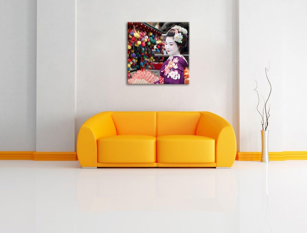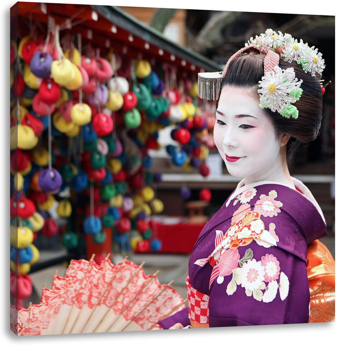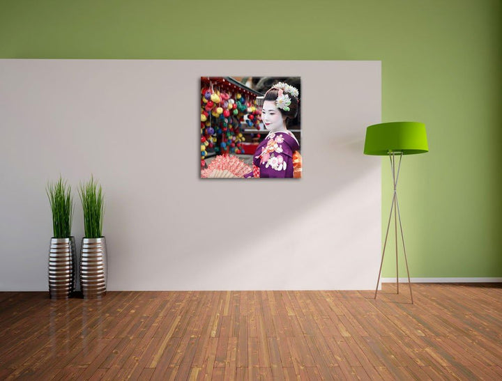 Anmutige Geisha mit Fächer, Format: 70x70 auf Leinwand, XXL riesige Bilder fertig gerahmt mit Keilra
