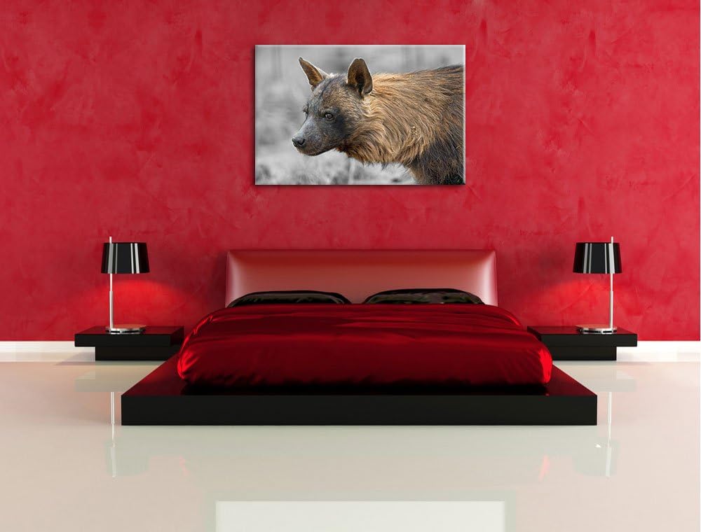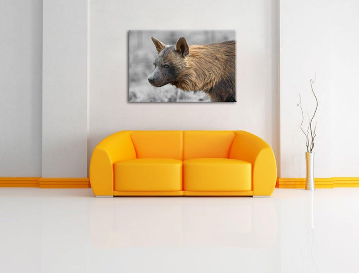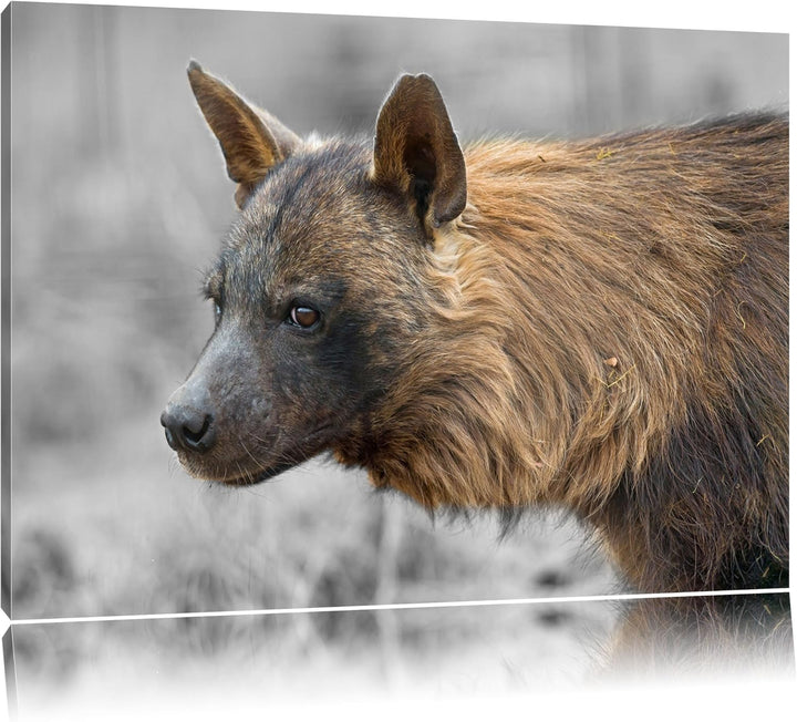 anmutige Hyäne im Wildgras schwarz/weiss auf Leinwand, XXL riesige Bilder fertig gerahmt mit Keilrah