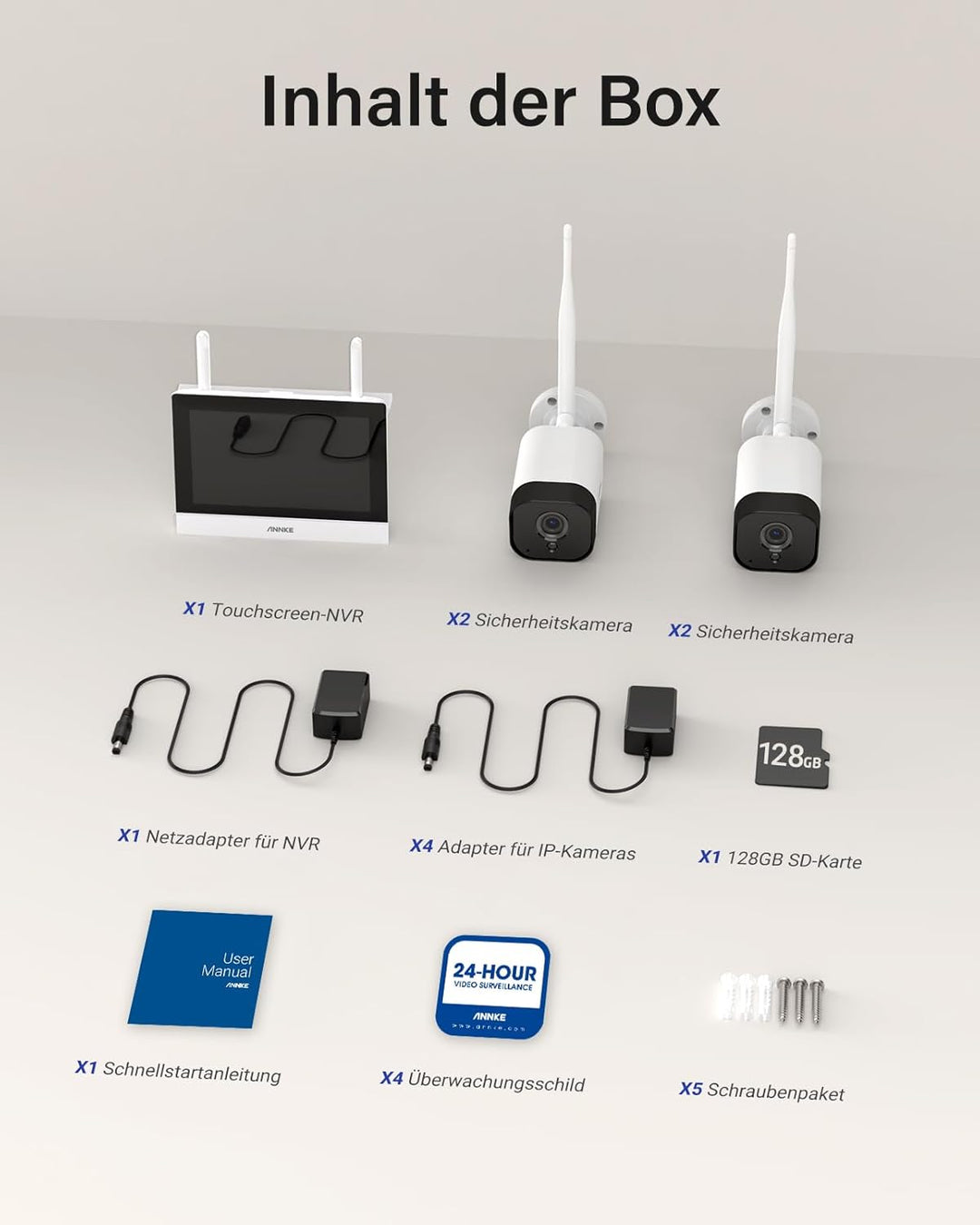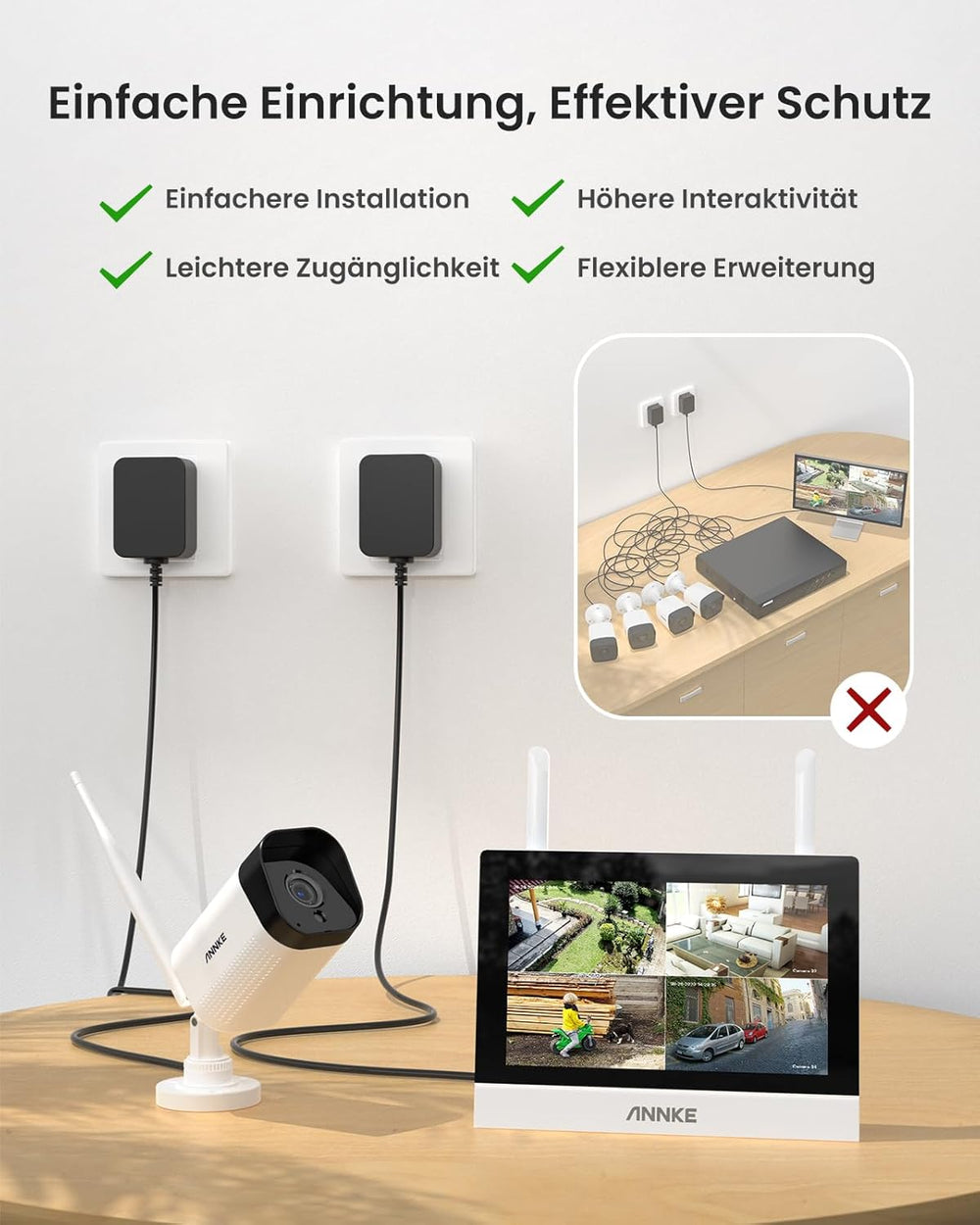 - 【Plug und play】 Die Überwachungskameras und die NVR haben gekoppelt worden, bevor sie dich erreichen, so gibt es keine Notwendigkeit, das Videokabel zu legen und die Einstellungen anpassen. Sie müssen nur den Monitor und die Kameras an die