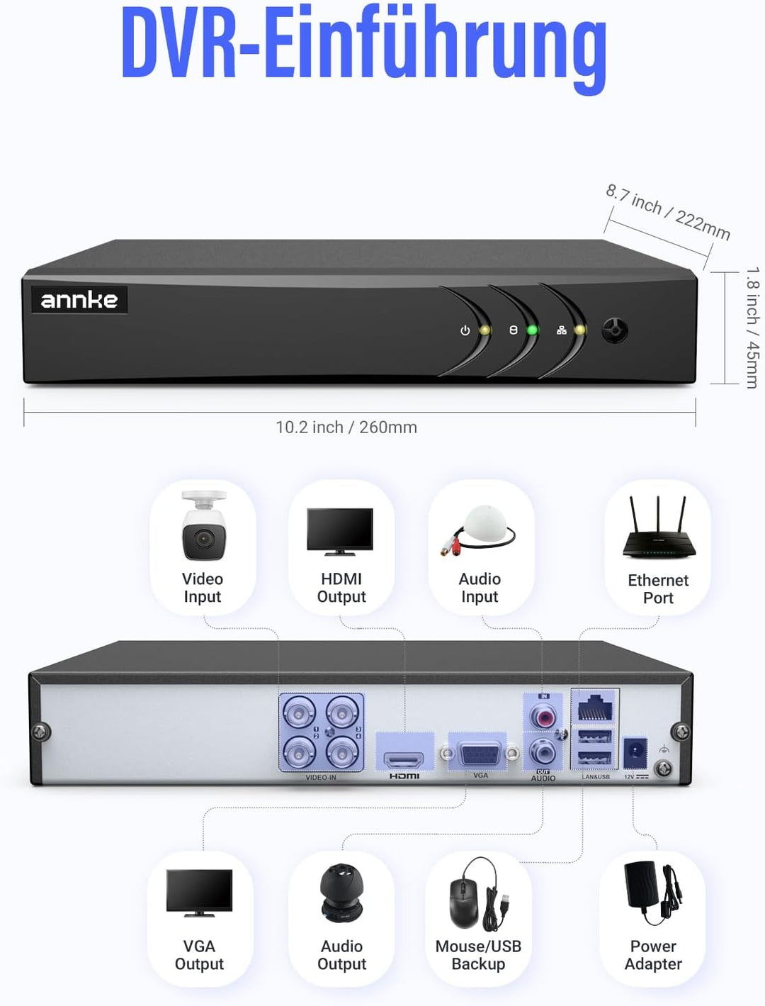 - 【Fernzugriff mit allen Geräten und Browsern】 Verbinden Sie den DVR mit einem Router und laden Sie die ANNKE Vision App herunter, um den DVR aus der Ferne zu steuern. Greifen Sie mit Ihren Smartphones, Tablets, Computern und Browsern (Google Chrome,