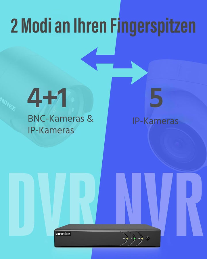 - 【5 in 1 Hybrid DVR】 Der erweiterbare Hybrid-Digital-Videorecorder, der die Funktionalität von DVR / NVR / HVR kombiniert, unterstützt bis zu 4 TVI, AHD, CVI, CVBS und 2 zusätzliche IP-Kameras. Somit haben Sie die Wahl zwischen einem kompletten