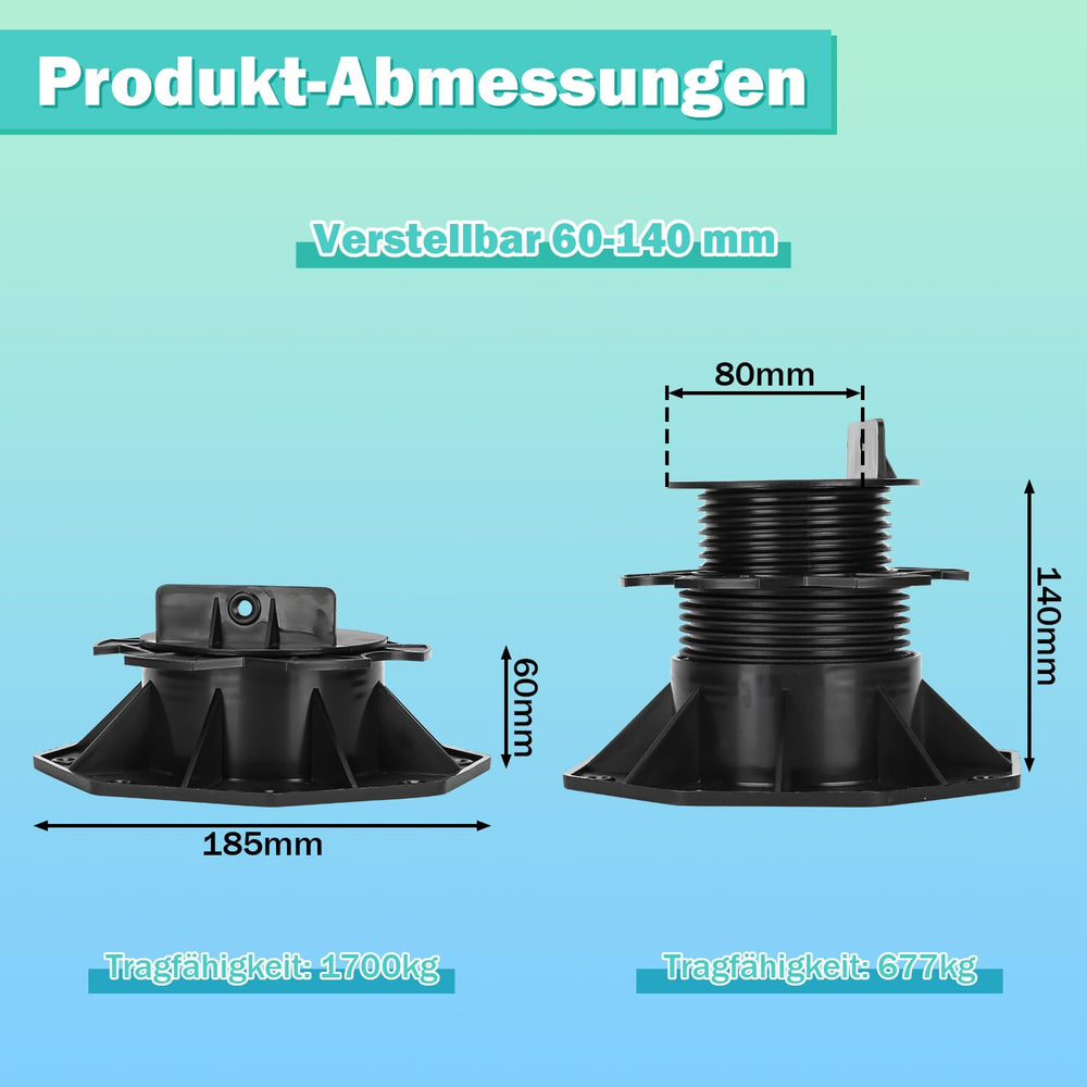 - Höhenverstellbar ,stufenlos höhenverstellbar von 60 - 140 mm, Mit dem Terrassenlager wird durch einfaches Links-/Rechtsdrehen stufenlos das Höhenniveau eingestellt.