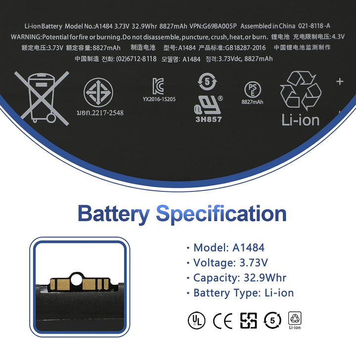 - 【Akku Spezifikationen】Akku-Typ: Wiederaufladbares Lithium-Polymer; Kapazität: 8827mAh/32.9Wh ; Spannung: :3.73 V; Batterielebensdauer:Erwartete Lebensdauer von mehr als 1000 Ladezyklen