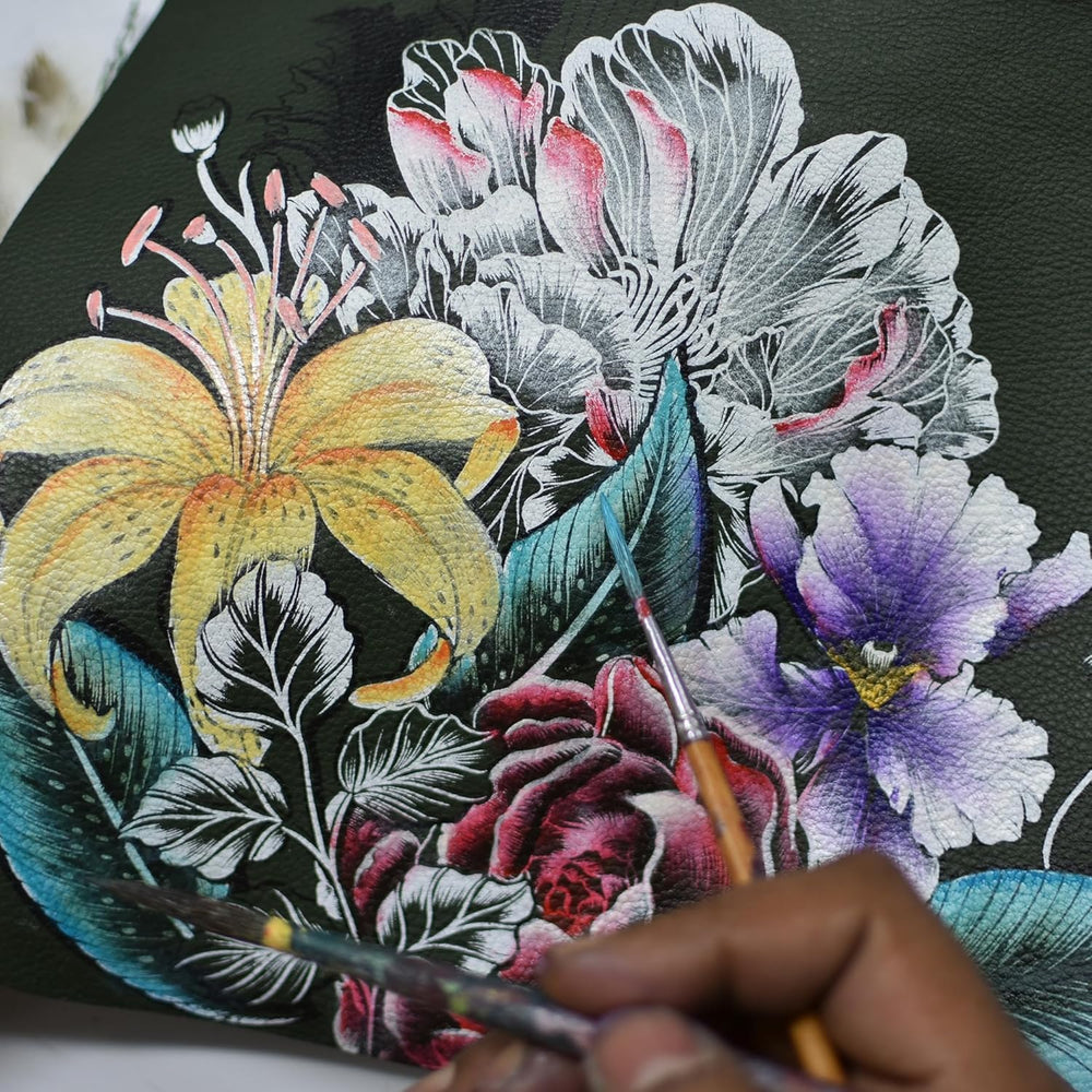 - VINTAGE FLORAL — Jede Tasche ist handbemalt, um ein Kunstwerk zu schaffen, das von der Natur und Vintage-Themen inspiriert ist. Zarte Blüten und raffinierte Details vermitteln ein Gefühl zeitloser Schönheit und Nostalgie