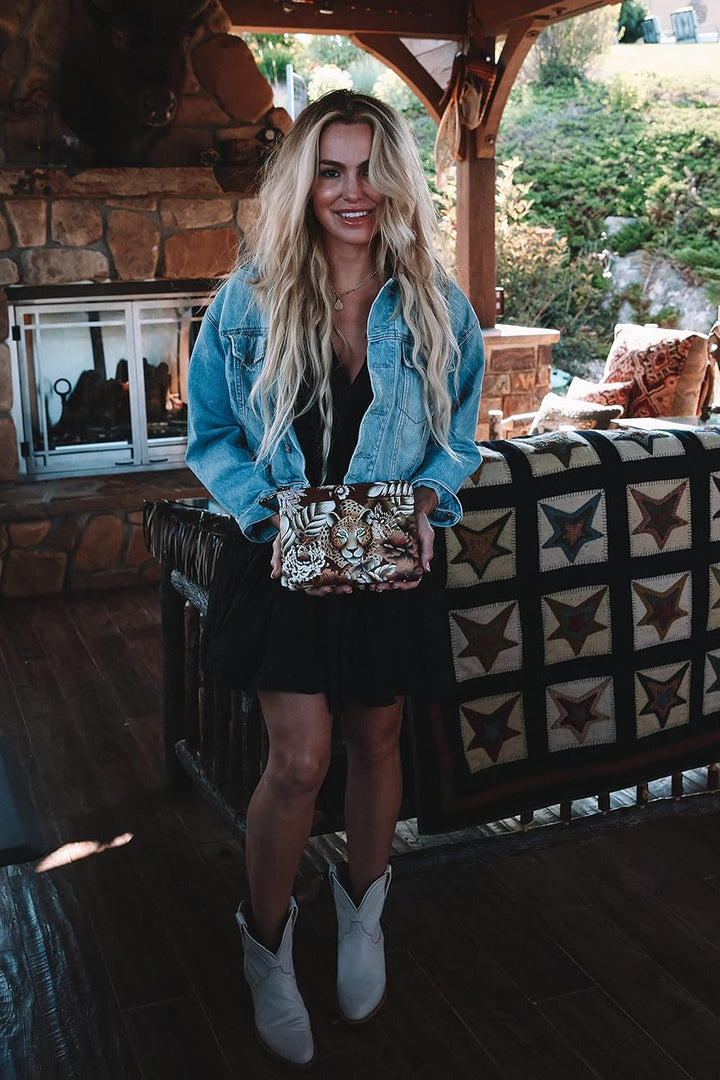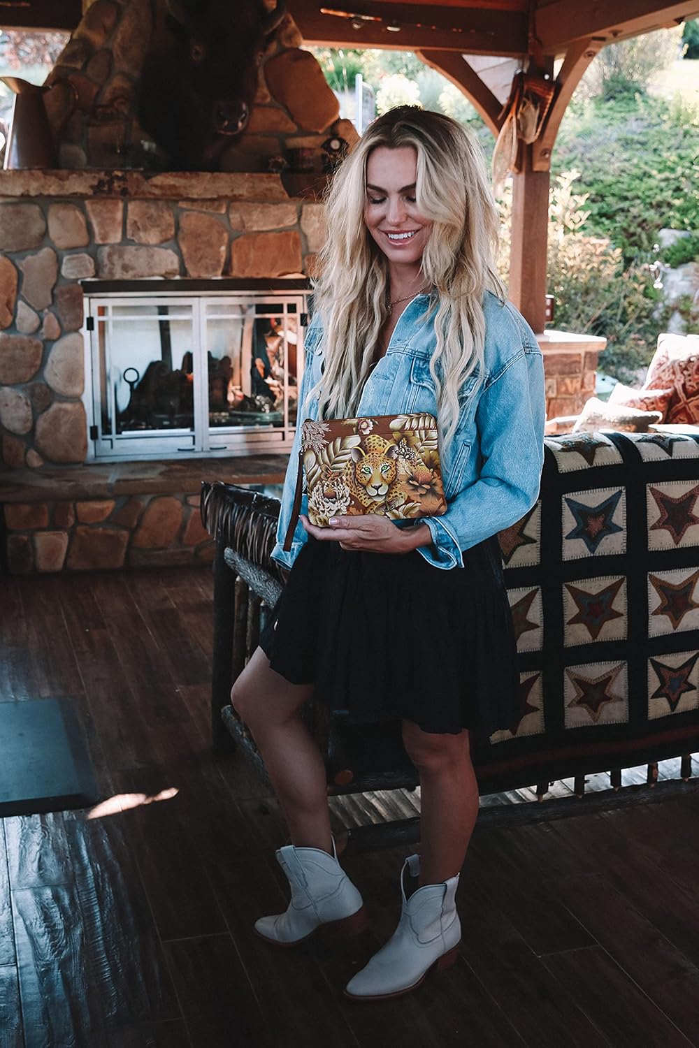 - CLEOPATRA'S LEOPARD TAN ARTWORK - Jede Clutch ist handbemalt, um ein Kunstwerk zu schaffen, das von Natur und Vintage-Themen inspiriert ist. Inspiriert von Kleopatras Haustier Arrow, streift eine grosse, Katze mit hypnotisierenden grünen Augen durch die