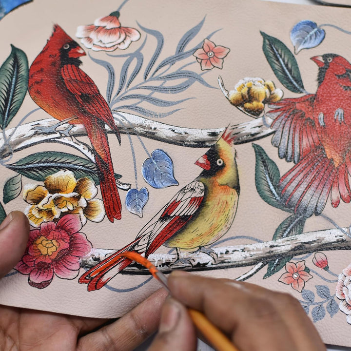 - CARDINAL FAMILY - Jede Tasche ist handbemalt, um ein von der Natur und Vintage-Themen inspiriertes Kunstwerk zu schaffen. Die Schar prächtiger Kardinäle mit leuchtendem Federkleid thront erhaben auf einem kräftigen Ast