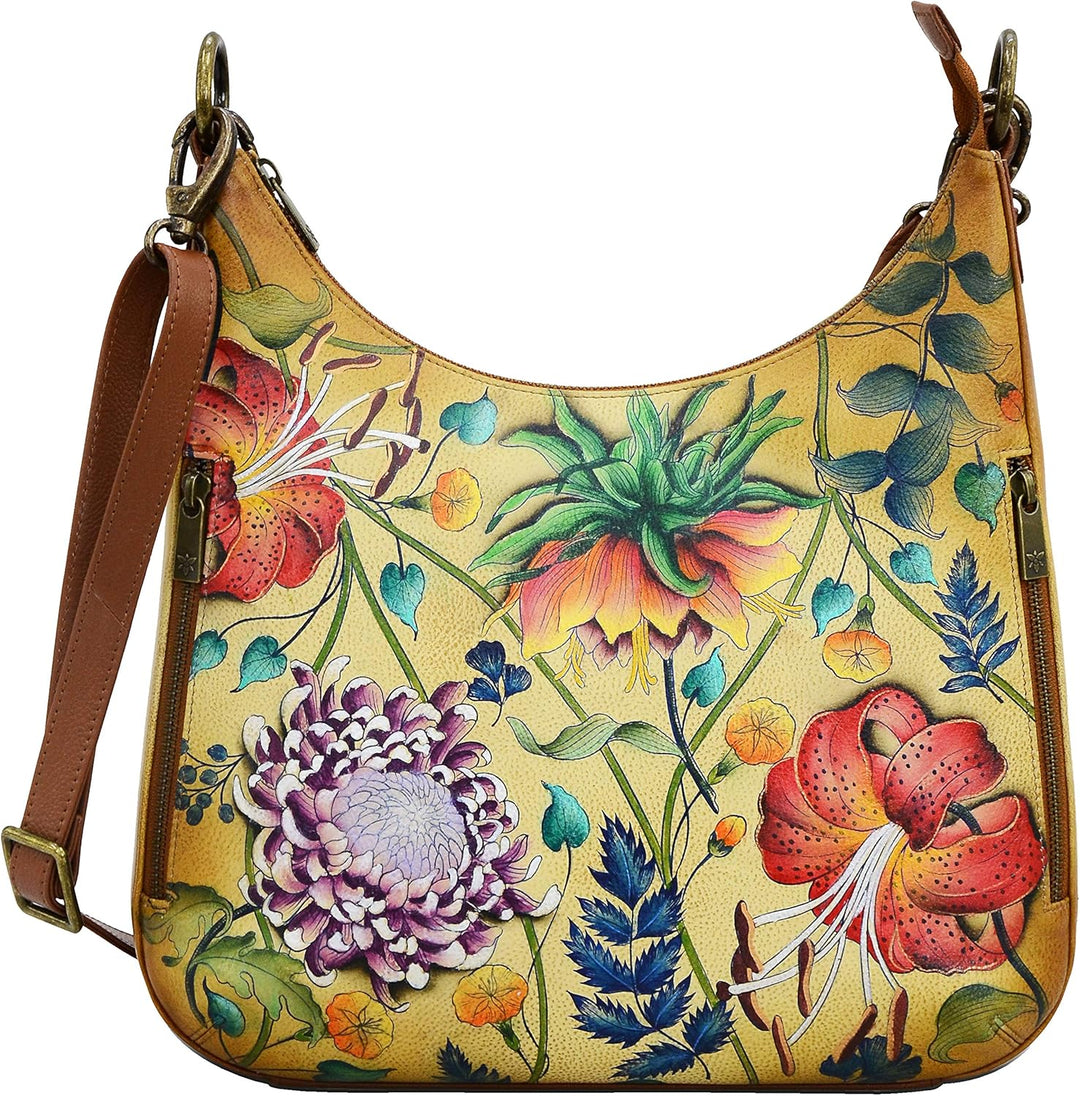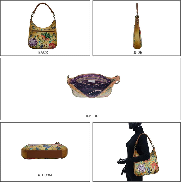 PRODUKTBESCHREIBUNGEN Als Swapan Basu Anfang der 80er Jahre durch Zufall auf die Idee kam, handbemalte Accessoires herzustellen, suchte er schnell Hilfe bei seiner besten Freundin und Ehefrau Roma. Im Jahr 1984 begann Roma mit dem Entwurf von handbemalten Taschen aus weichem Leder und entwickelte im Laufe der Jahre das Verfahren und die Maltechnik weiter. Heute ist es ein streng gehütetes Familiengeheimnis. Farben sind ein sehr kraftvolles Element in diesen Designs. Die breite Palette an abstrakten, farbenfrohen, fantasievollen und naturgetreuen Motiven, die in gedeckten Farben unterschiedlichster Intensität dargestellt sind, verwandelt jede Handtasche in ein Objekt zeitloser Vintage-Kunst.