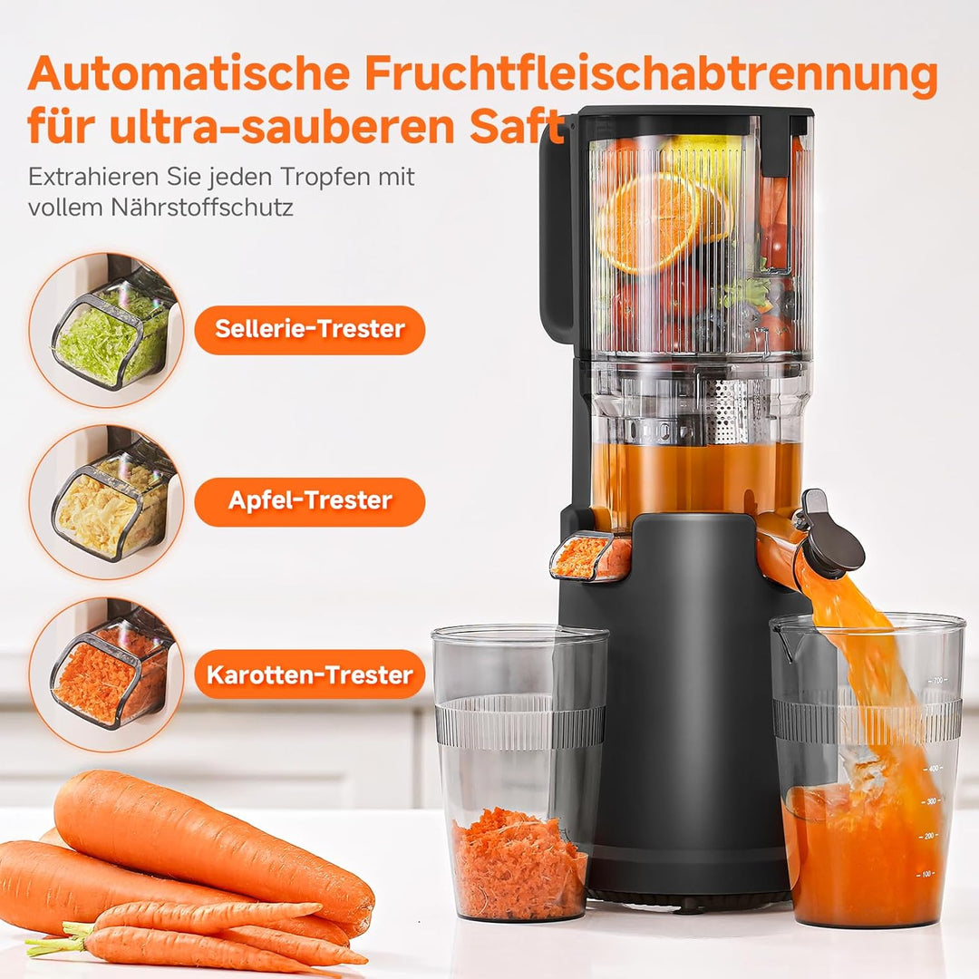 - Dreifachfilter & Spiralsystem – Hohe Saftausbeute garantiert Dank automatischer Schneid-Spirale erzielt der entsafter gemüse und obst testsieger bis zu 95% Saftausbeute – geeignet für Sellerie, Rote Beete, Trauben u.v.m. Ein echter juicer