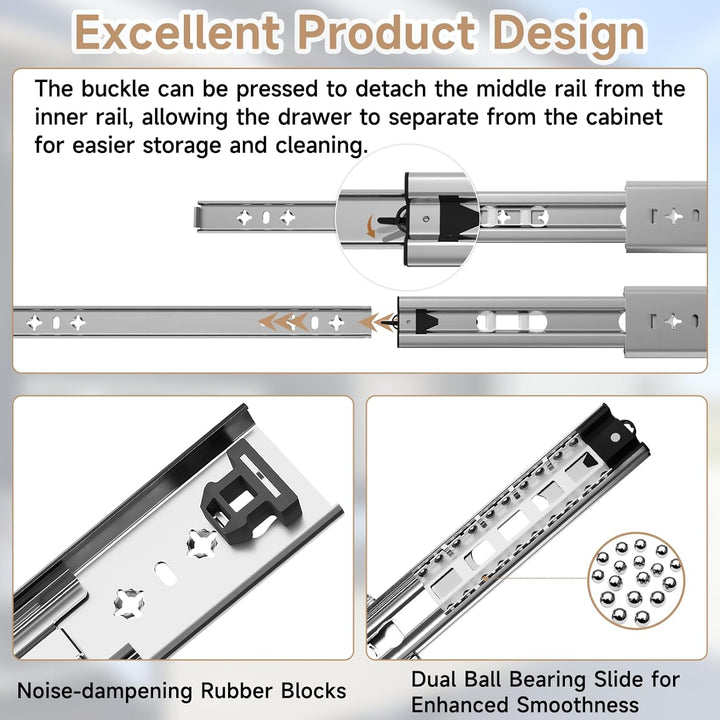 - 【Abnehmbar und glatt】 Auf der Rückseite der Gleitschiene befindet sich eine schwarze Kunststoffschnalle, und die Schublade kann durch Drücken leicht herausgenommen werden. , Einfach zu installieren Massive Stahlkugeln machen das Öffnen der