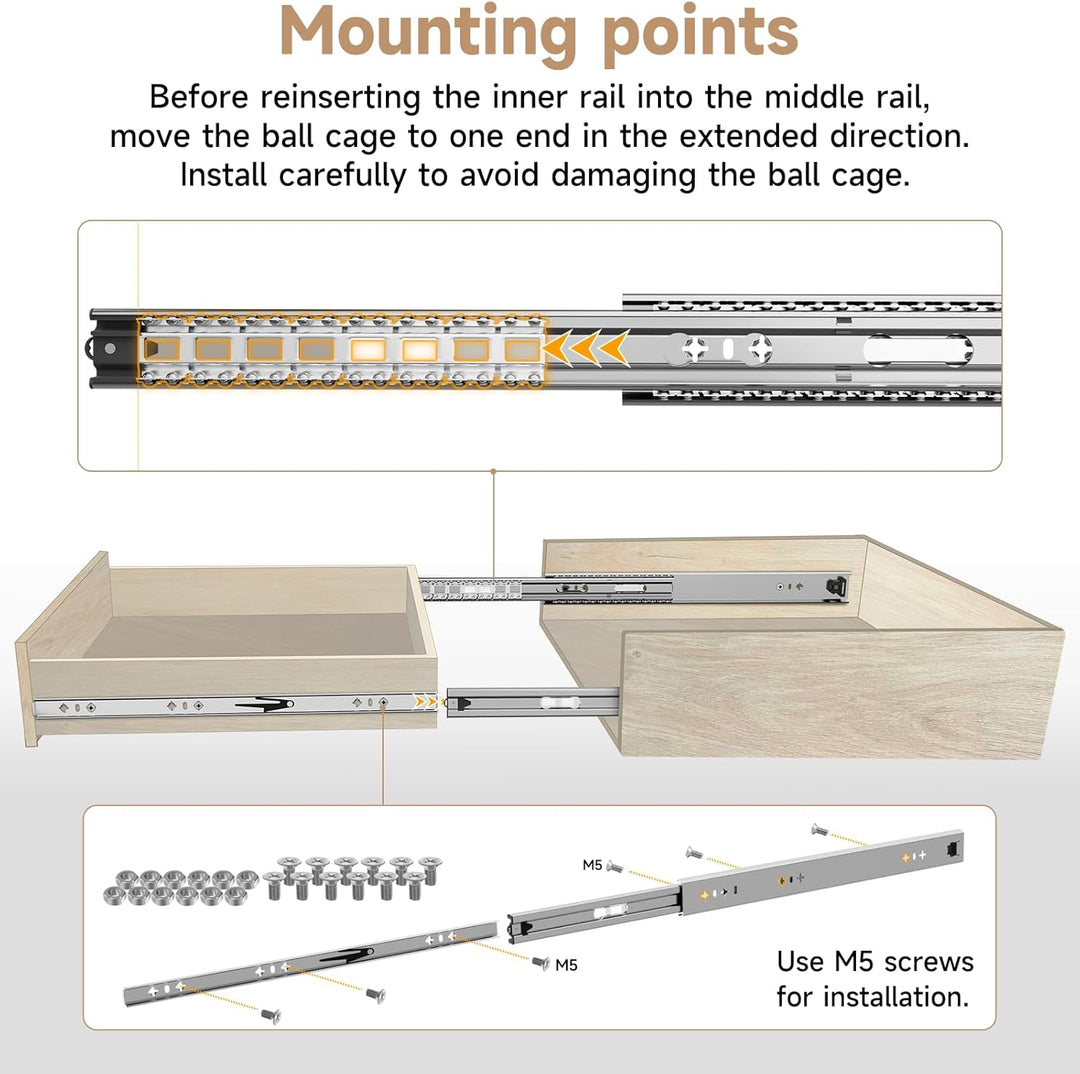 • 【Abnehmbar und glatt】 Auf der Rückseite der Gleitschiene befindet sich eine schwarze Kunststoffschnalle, und die Schublade kann durch Drücken leicht herausgenommen werden. , Einfach zu installieren Massive Stahlkugeln machen das Öffnen der Schublade sanfter und leiser.