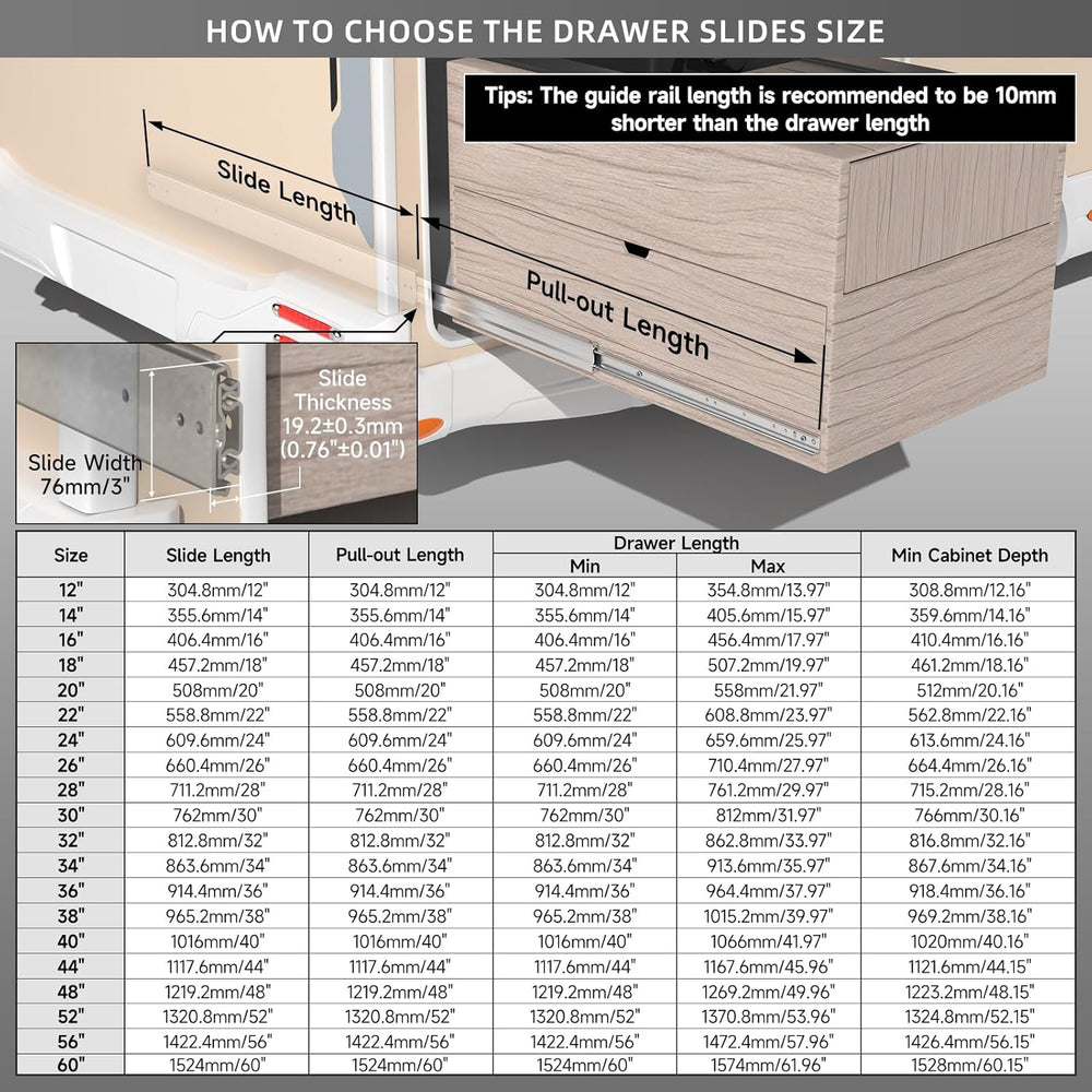 - 🏆【Runner Halterung 】 Der Einbauraum auf beiden Seiten der Schublade muss 19 mm * 2(0,75 Zoll * 2). Länge: 52 Zoll (1300 mm)。 Geeignet für lange Schranktiefen von 52-54 Zoll (1300-1350 mm) .Hinweis: Schrauben sind nicht im Lieferumfang