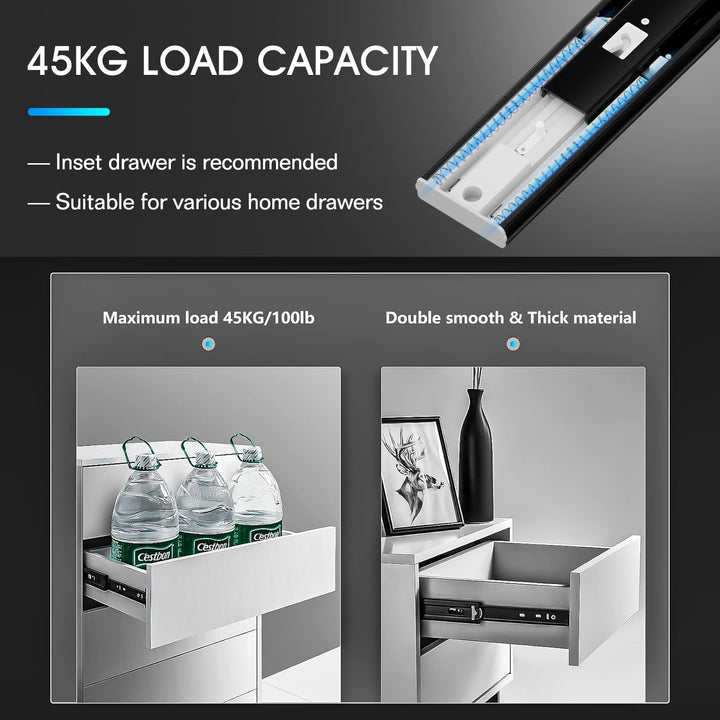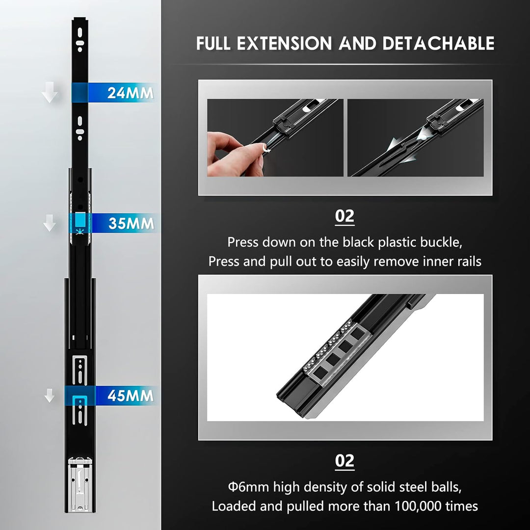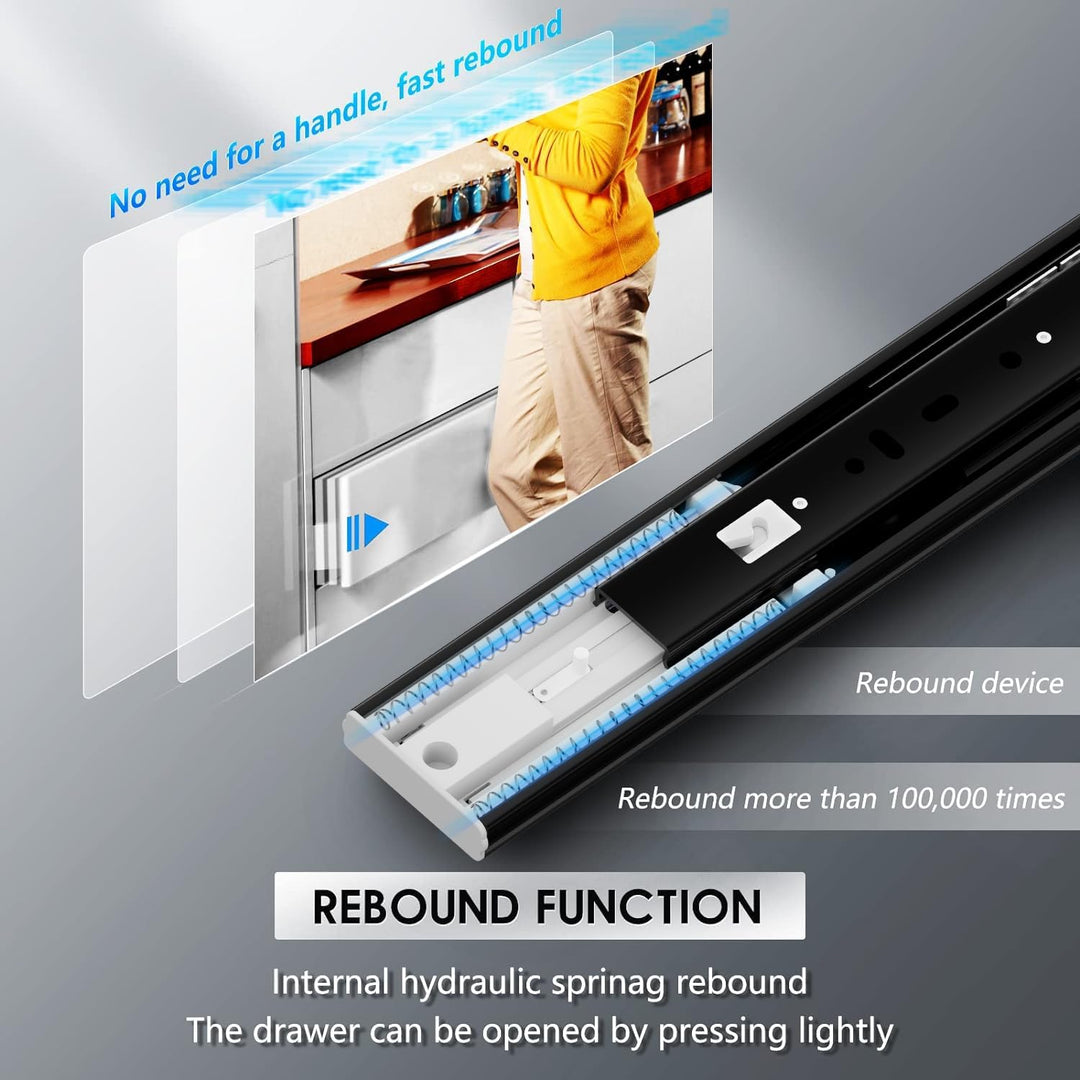 • 【Push Open & Detachable】 Dies ist eine Push to Open Schubladenschiene, ohne dass Sie an den Händen ziehen müssen. Die Schublade springt zurück und gleitet auf, sobald Sie sie berühren. , Auf der Rückseite der Gleitschiene und der Schublade