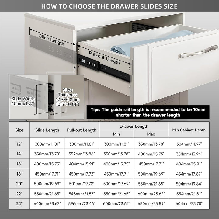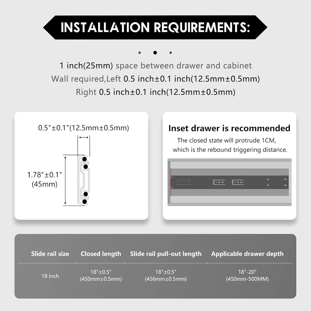 • 【Installationsanforderungen】 Grösse: Länge: 450 mm (18 Zoll) Sie können die Grösse der Schienen entsprechend der Tiefe der Schublade wählen. *Die Länge der Führung sollte ≤ der Länge der Schublade sein. Einbauabstand: 12,5 mm/0,5
