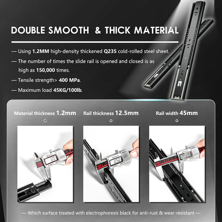 • 【Doppelt belastbar & Vollauszug】 AOLISHENG Schubladenführungen bestehen aus 1,2 mm hochwertigem kaltgewalztem Stahl, das Material ist 1,2-mal so dick wie gewöhnliche Führungen. Die Tragfähigkeit kann bis zu 45 kg betragen. Kugel