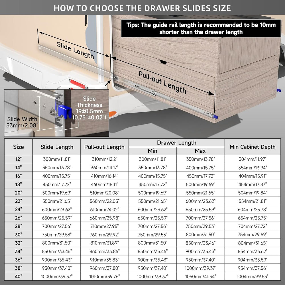 - 【Schubladenführung für seitliche Montage】 Menge: 1 Paar (2er-Pack) Keine Schrauben. Tragfähigkeit: 80 kg. Länge: 600 mm (24 Zoll). Sie können die Grösse der Schienen entsprechend der Tiefe der Schublade wählen. *Die Länge der Schiene sollte