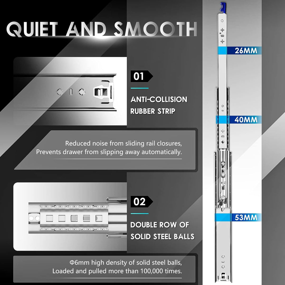 - 【Hochleistungs-Schubladenführungen verriegeln】Schwenken Sie die schwarzen Griffe zum Verriegeln und Entriegeln. Sie können sowohl geschlossen als auch vollständig geöffnet verriegelt werden. Verhindern Sie ein Verrutschen. 3-fach kugelgelagerte Schubladenführungen mit Vollauszug, sodass die Schublade vollständig herausgezogen werden kann, was praktisch zum Aufbewahren von Gegenständen ist.