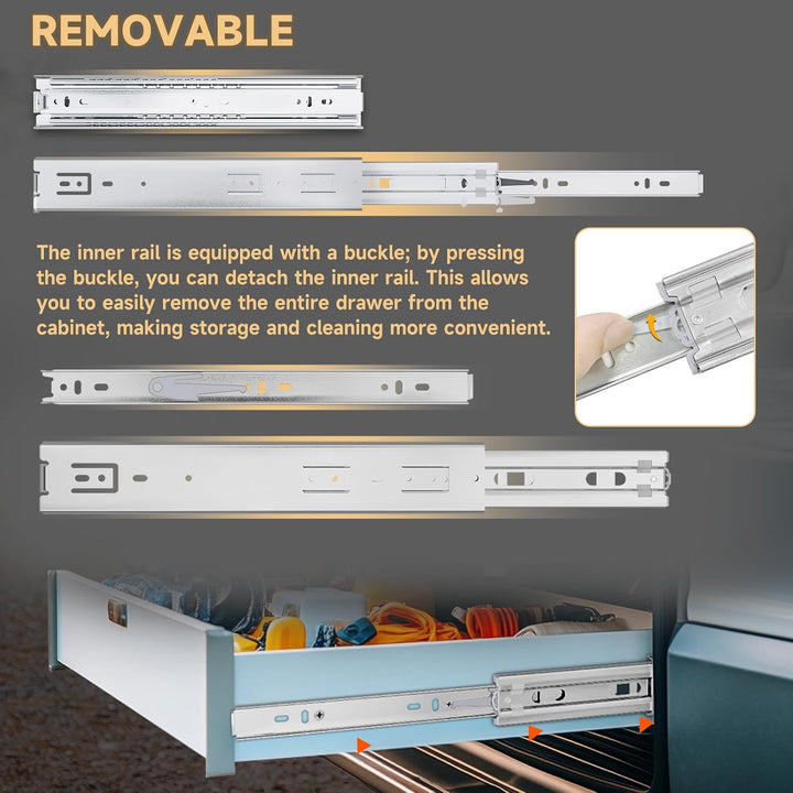- 【Abnehmbare Schubladenführung mit Vollauszug】: Auf der Rückseite der inneren Schiene befindet sich eine Kunststoffschnalle, die durch Drücken und Herausziehen entfernt werden kann Kollision während des Gebrauchs, Geräuschreduzierung.