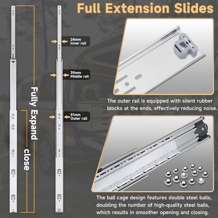 - 【Schwere Schubladenführung】:Grösse: 26" (650mm)- -Installationsdicke: 0,5"/12,7mm (jeweils)- -Breite: 2"(50mm)- -Tragfähigkeit: 50 kg - -Vollständig ausgefahrene Länge: 52 "---Lieferumfang: Schubladenführung 2er Set (1 Paar Schienen)