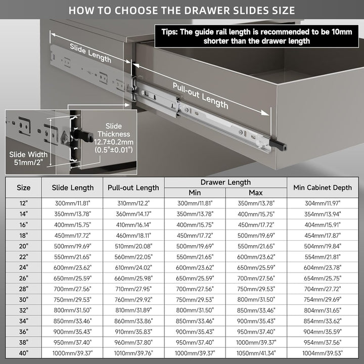 • 【Abnehmbar und glatt】 Drücken und halten Sie bei Vollauszug den schwarzen Verriegelungsgriff und ziehen Sie ihn heraus, um die Trennung abzuschliessen. , Einfach zu installieren glatter und leiser.