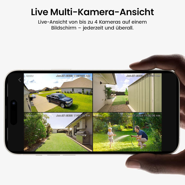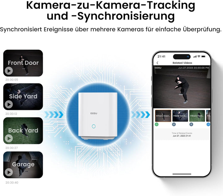 - Neue Erfahrung Mit AOSU: 1. Kameraübergreifendes Verfolgung– verbindet automatisch Videos von Ereignissen im selben Zeitraum für eine einfache Überprüfung. 2. Sehen Sie Live-Streams aus 4 Bereichen gleichzeitig auf einem Bildschirm, um ein