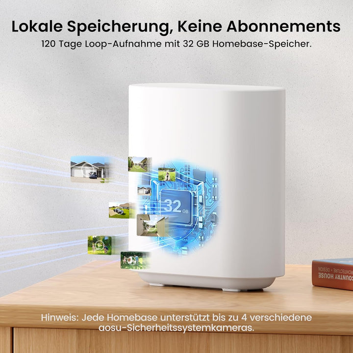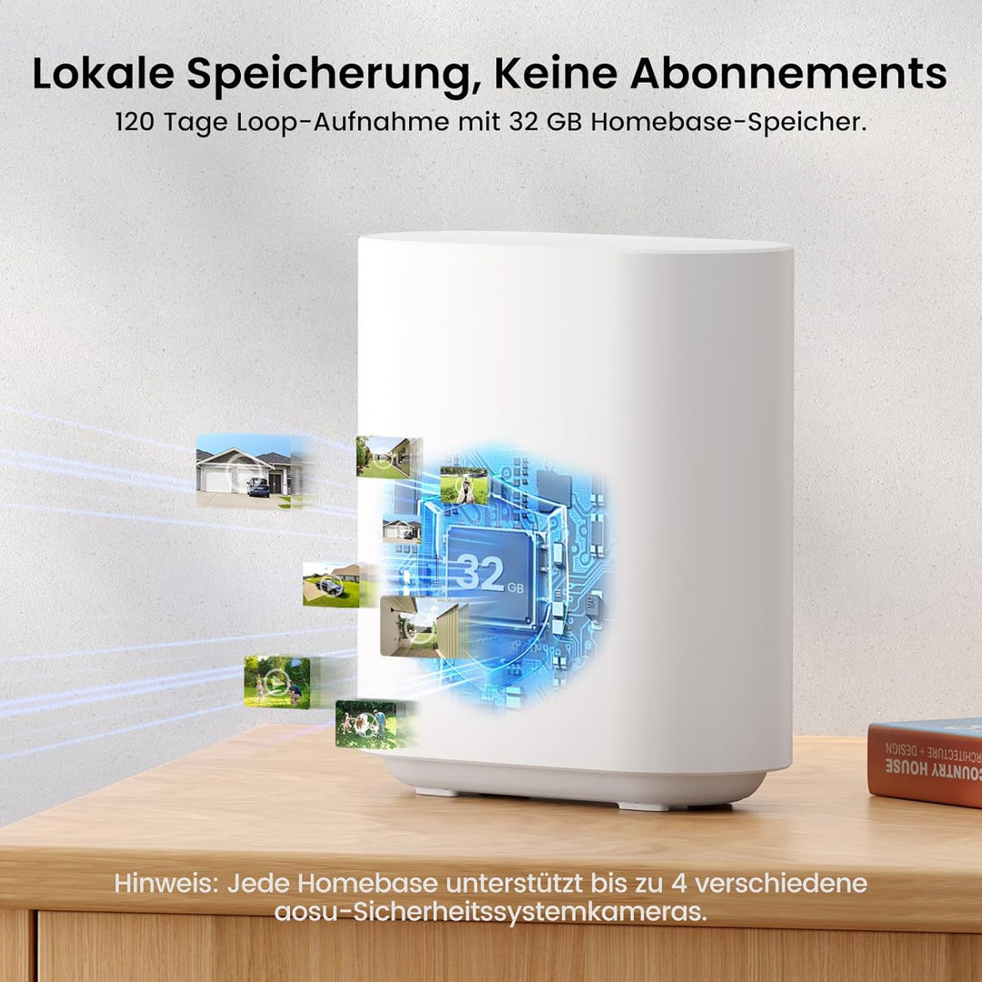 - Keine Monatlichen Gebühren mit Homebase: Alle Aufnahmen werden verschlüsselt und in der Homebase ohne Abonnement oder versteckte Kosten gespeichert. 32 GB lokaler Speicher bieten bis zu 4 Monate Videoaufzeichnung in Schleife. Selbst wenn die wlan