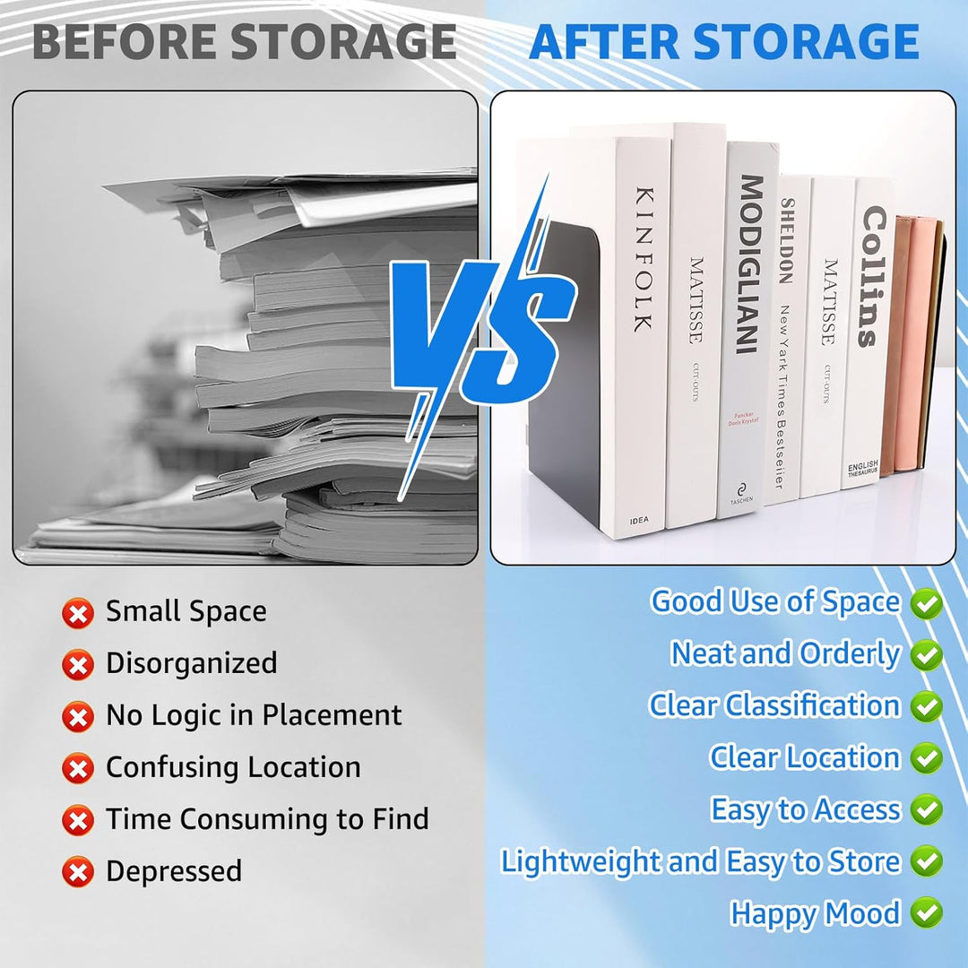 - 【HOCHWERTIGES MATERIAL】Die schwarzen Buchstützen sind aus Metall-Eisen-Material mit elektrostatischer Malerei Oberfläche, stark und langlebig, nicht leicht zu verformen. Die Buchstützen halten auch schwere Bücher ordentlich, aufrecht und nicht
