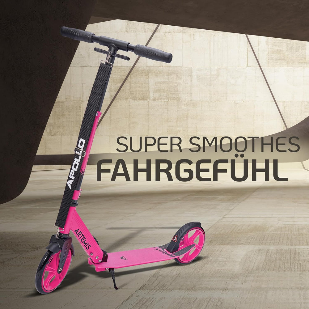 • FAHRSPAss PUR: Apollo City-Scooter Artemis - ein klappbarer und höhenverstellbarer Kickscooter mit 200mm Big Wheels. Der enthaltene Tragegurt und der Fussständer machen ihn perfekt für erwachsene Pendler zum Mitnehmen in Zug, Bus & Bahn.