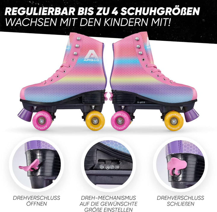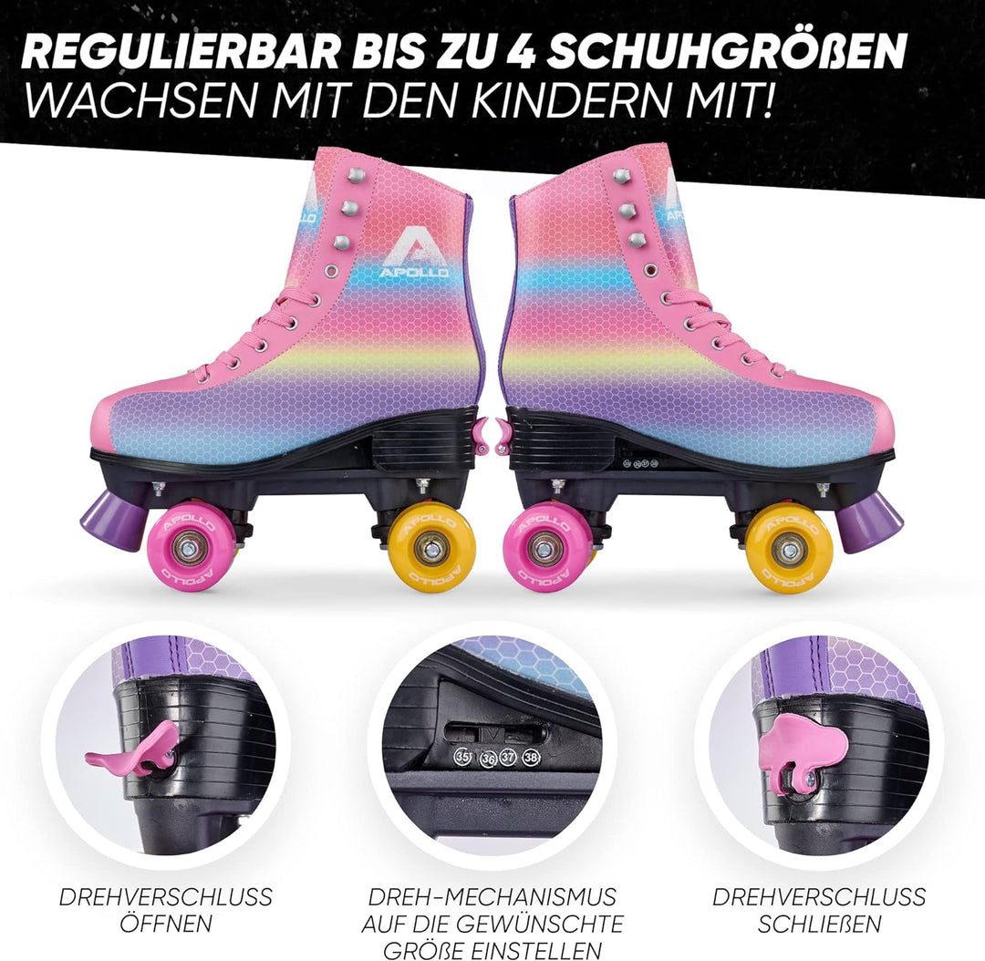 - FLEXIBILITÄT: Kindeleicht bis zu 4 Schuhgrössen verstellbare Roller Skates für einen Fahrspass von langer Dauer. So können diese Rollschuhe Mädchen und Jungs mehrere Jahre begleiten.