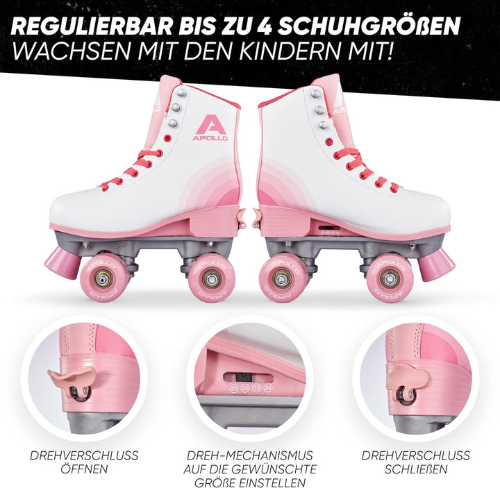 - FLEXIBILITÄT: Kindeleicht bis zu 4 Schuhgrössen verstellbare Roller Skates für einen Fahrspass von langer Dauer. So können diese Rollschuhe Mädchen und Jungs mehrere Jahre begleiten.