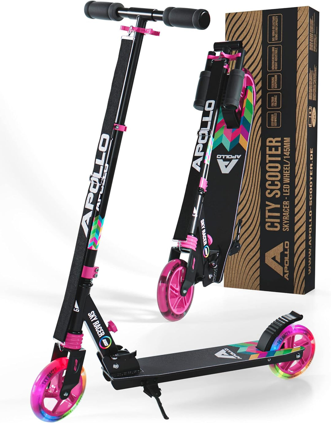 - LEUCHTENDER FAHRSPASS: Der Apollo City-Scooter SkyRacer ist klappbar und höhenverstellbar, ausgestattet mit Stossdämpfern und Abec 7 Kugellagern. Leuchtende 145mm LED Wheels machen unseren stylischen Scooter zum absoluten Hingucker!