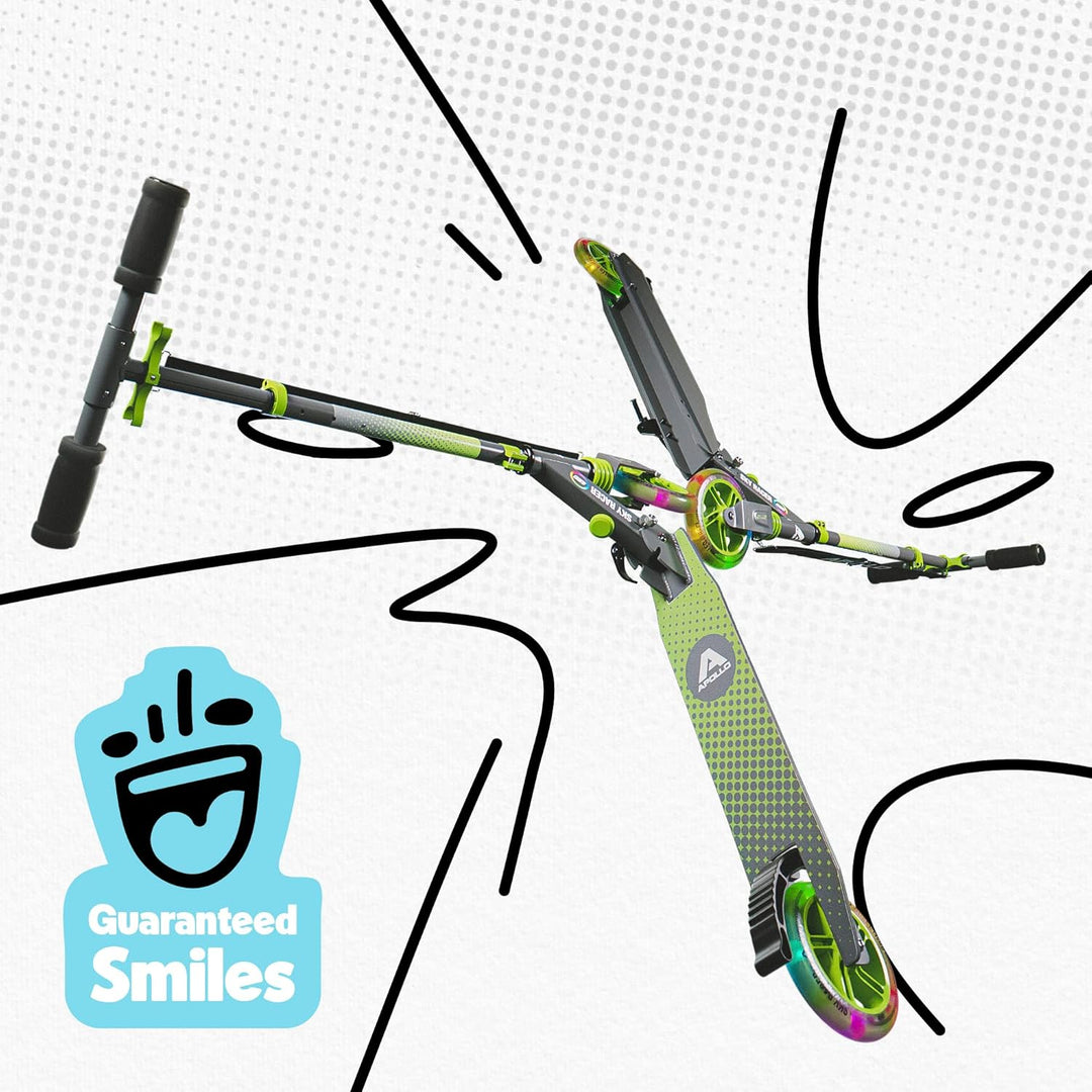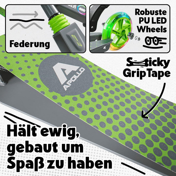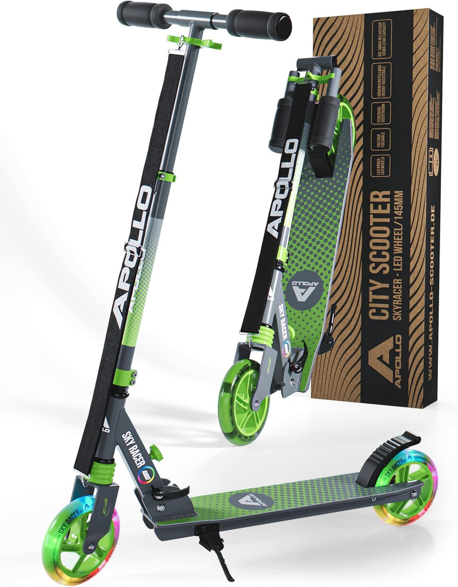 - LEUCHTENDER FAHRSPASS: Der Apollo Skyracer Scooter Kinder ist klappbar und höhenverstellbar, ausgestattet mit Stossdämpfern und Abec 7 Kugellagern. Leuchtende 145mm LED Rollen machen unseren Kinder Roller zum absoluten Hingucker! Sehr hochwertiger,