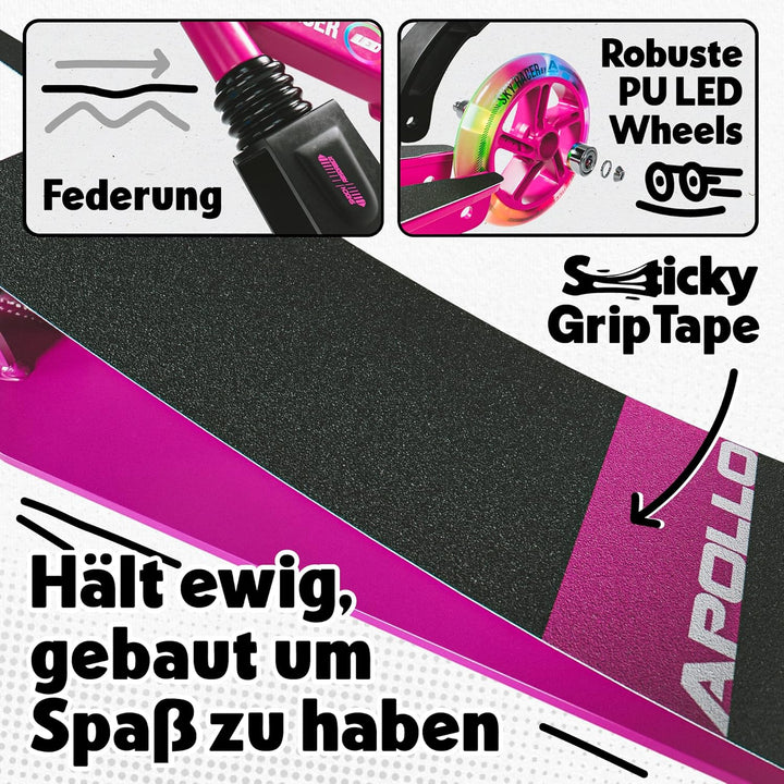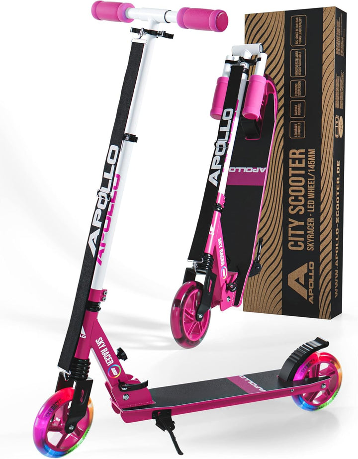 - LEUCHTENDER FAHRSPASS: Der Apollo City-Scooter SkyRacer ist klappbar und höhenverstellbar, ausgestattet mit Stossdämpfern und Abec 7 Kugellagern. Leuchtende 145mm LED Wheels machen unseren stylischen Scooter zum absoluten Hingucker!