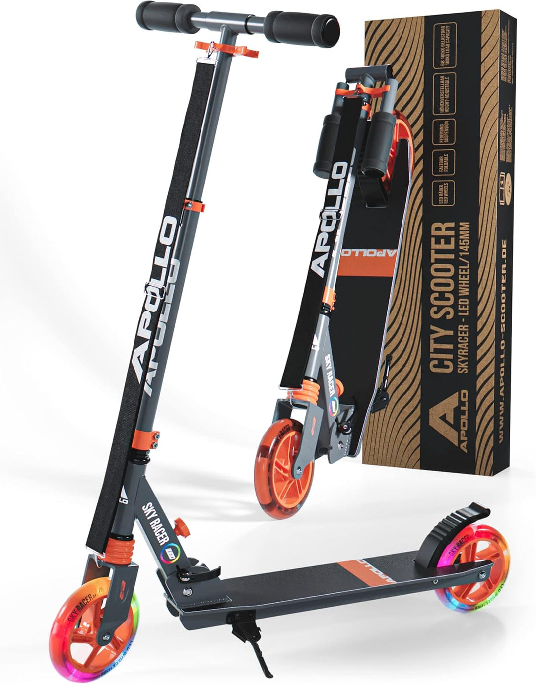 - LEUCHTENDER FAHRSPASS: Der Apollo City-Scooter SkyRacer ist klappbar und höhenverstellbar, ausgestattet mit Stossdämpfern und Abec 7 Kugellagern. Leuchtende 145mm LED Wheels machen unseren stylischen Scooter zum absoluten Hingucker!