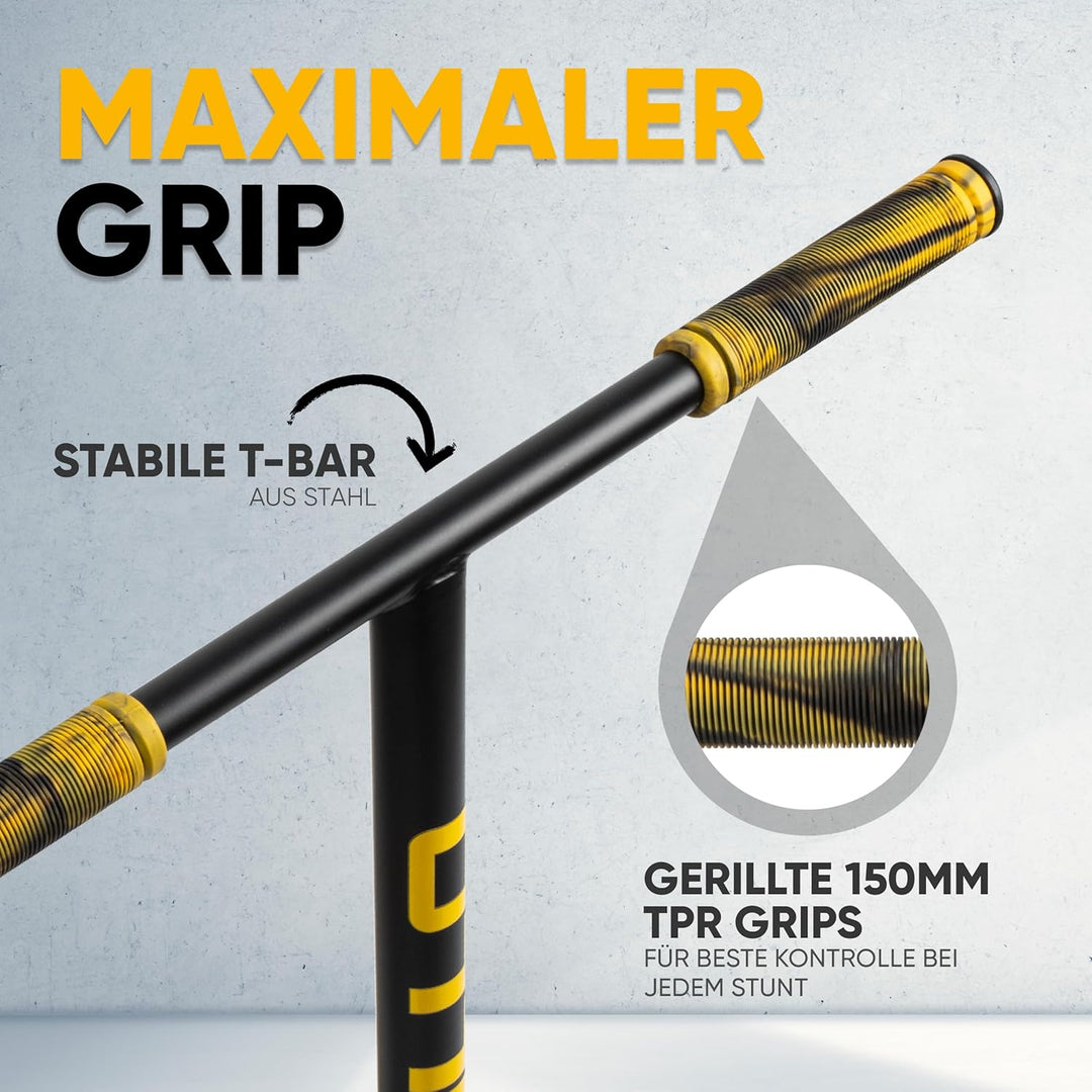 - STYLISCH - Mit neuen coolen Designs ist der Scooter ein absoluter Blickfang! Die rutschfeste Trittfläche und die geriffelten TRR Grips des Stuntscooters garantieren die nötige Sicherheit
