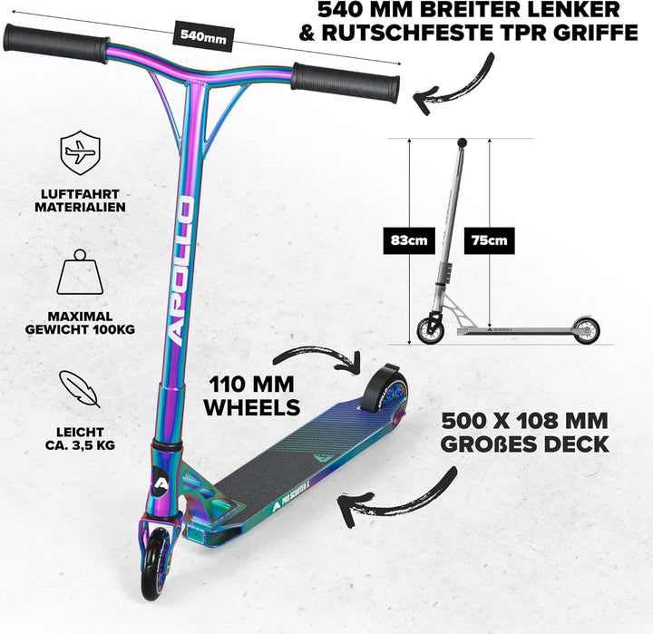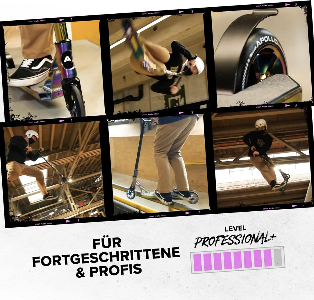 - HIGH END PRO SCOOTER: Der Apollo Profi Stunt Scooter Genesis Pro X ist ideal für Fortgeschrittene. Dieser hochwertige Funscooter mit seiner intuitiven Handhabung scheut keinen Vergleich