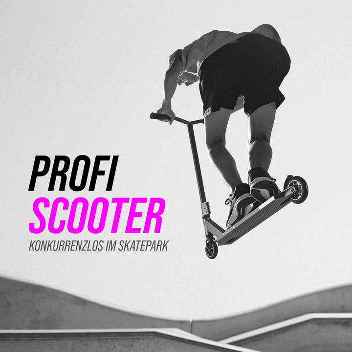• LIKE A PRO: Der Stuntroller Rahmen besteht aus HQ Aluminium, darüber hinaus verfügt der Scooter über 110mm PU-Scooter Rollen mit Alu Core & ABEC 9 High Speed Kugellager.