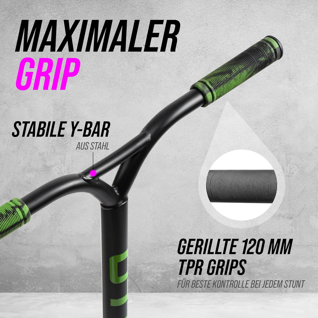 • COOL, ABER MIT SICHERHEIT: Mit dem angesagten Design ist der Scooter ein absoluter Blickfang! Die rutschfeste Trittfläche und die geriffelten TPR Grips des Stuntscooters sorgen für die nötige Sicherheit.