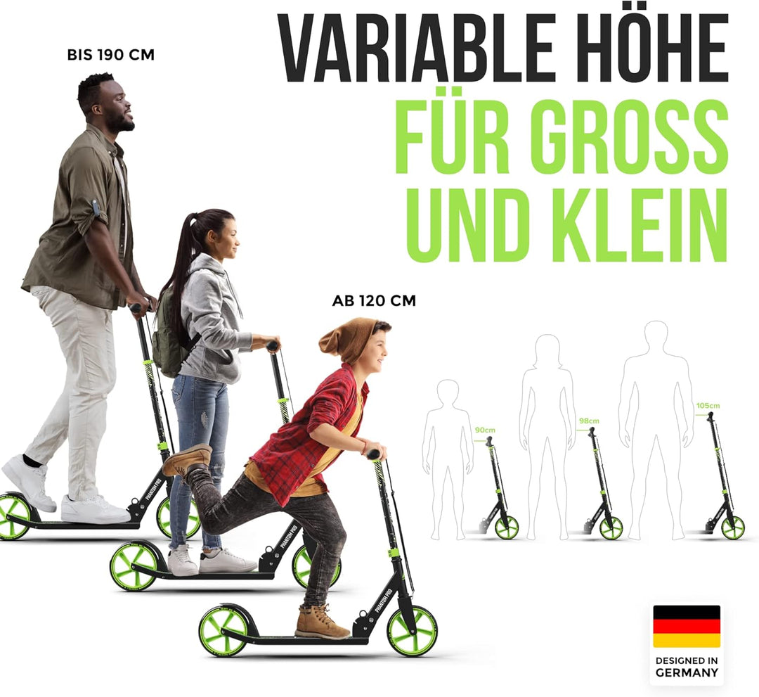 - 1 KLICK SYSTEM: Durch den praktischen Klappmechanismus mit Schnellspanner wird der Lenker des Kick-Scooter in Sekunden umgeklappt und der grosse Roller lässt sich platzsparend verstauen. Für Kinder ab 7 / Erwachsene / von 120cm bis 190cm / bis 100kg