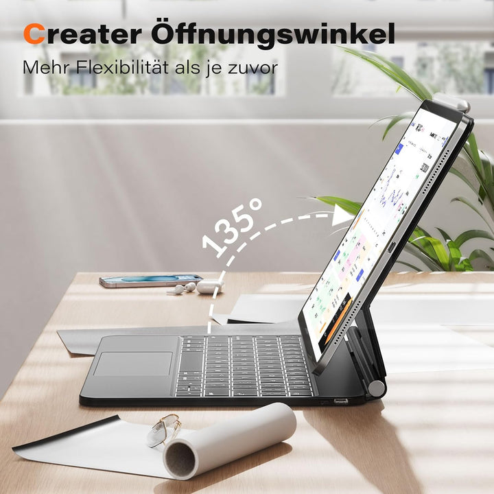 - [MAGIC KEYBOARD Ergonomisch perfektioniert] Diese iPad Pro 12,9-Tastatur unterstützt einen um 135° verstellbaren Öffnungswinkel und ergänzt ergonomische Prinzipien. Finden Sie Ihren idealen Blickwinkel für Arbeit, Freizeit oder kreative Aktivitäten.