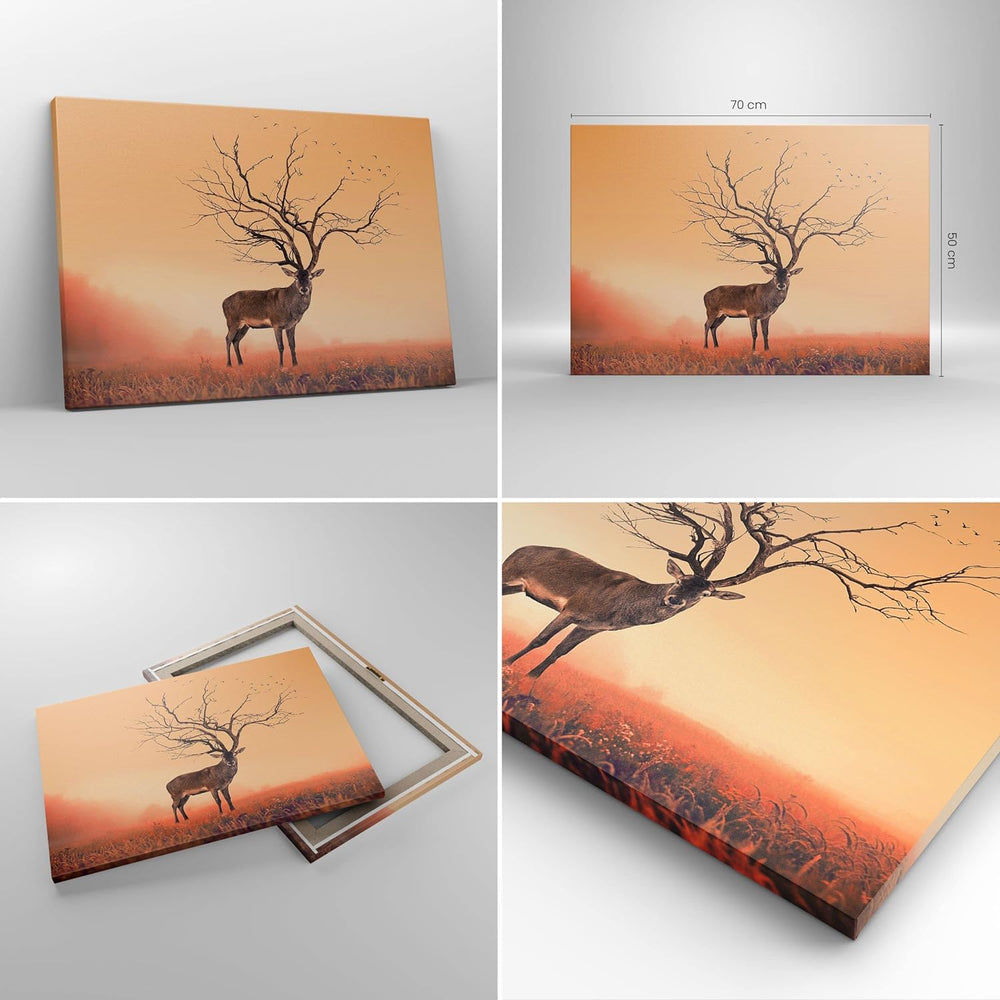 ARTTOR Bilder auf Leinwand Hirsch Baum Nebel Wald Leinwandbild 70x50cm Wandbilder Dekoration Wohnzim