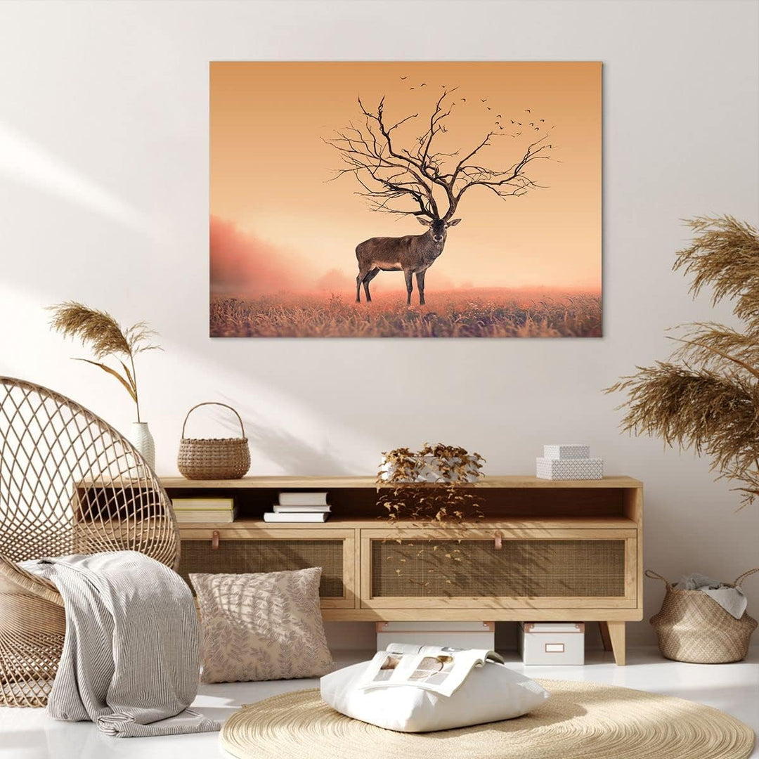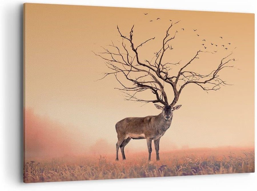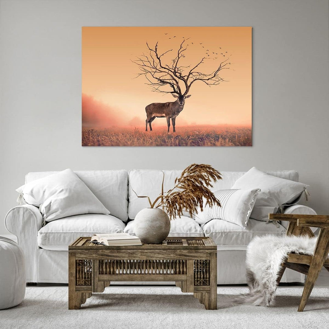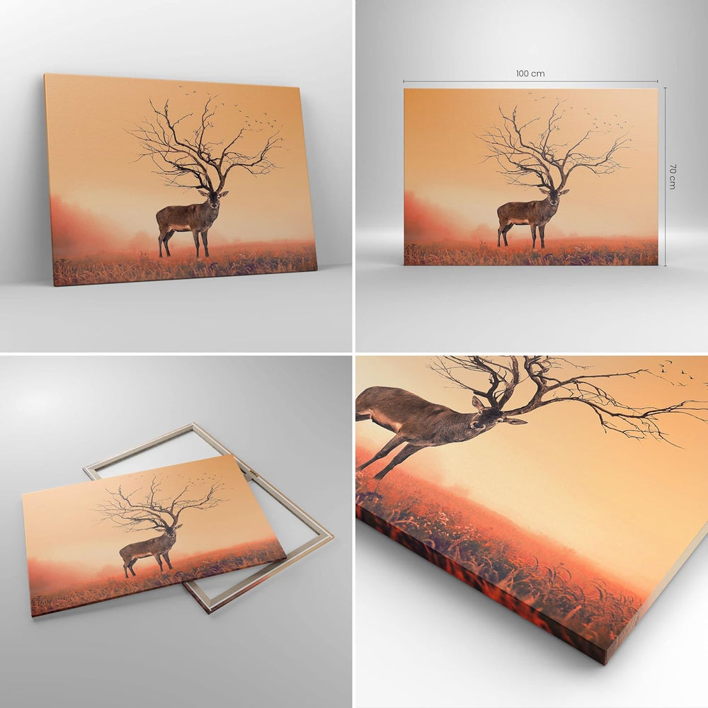 ARTTOR Bilder auf Leinwand 100x70cm Leinwandbild Hirsch Baum Nebel Wald Gross Wanddeko Bild Schlafzi