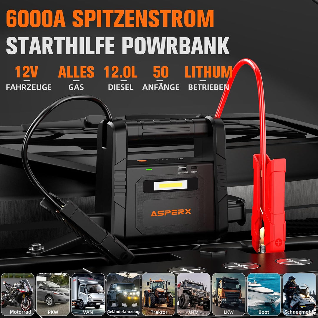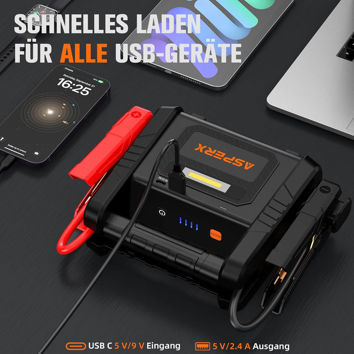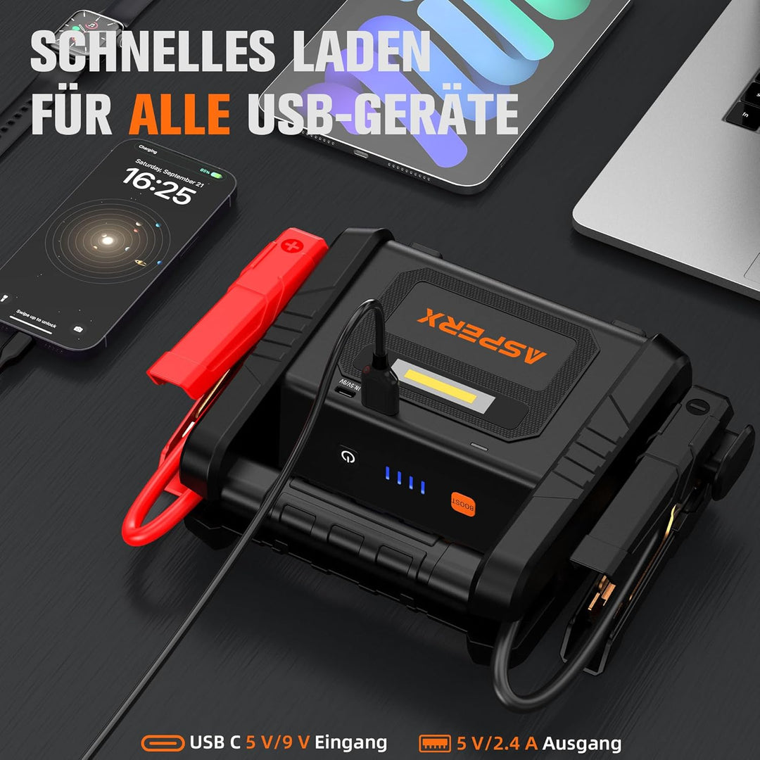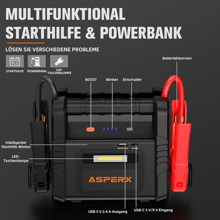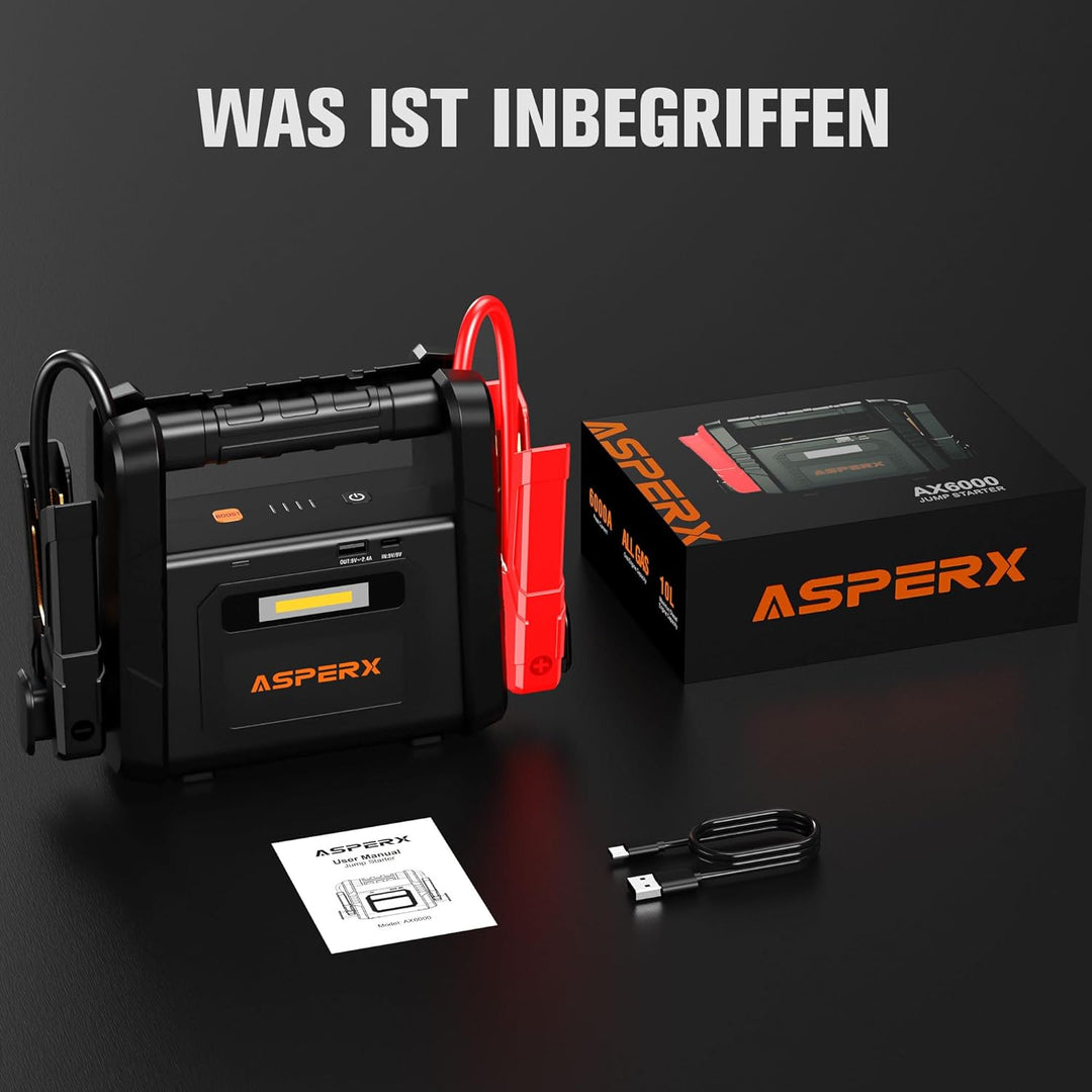 - Lieferumfang - 1 x Tragbarer Jump Starter, 1 x USB-Ladekabel, 1 x Benutzerhandbuch. Zudem erhalten Sie lebenslangen, professionellen technischen Support. Bei Fragen oder Problemen mit den tragbaren Starthilfegeräten von ASPERX können Sie uns jederzeit
