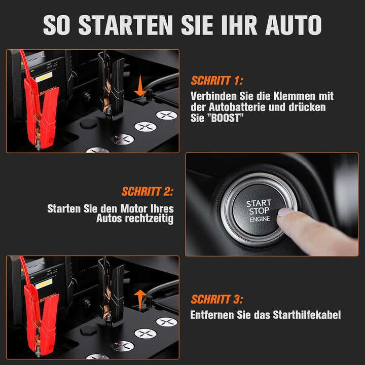 - 6000A Tragbare Starthilfe Powerbank - Die ASPERX AX6000 Auto Starthilfe bietet einen Spitzenstrom von 6000 A und kann eine leere 12-V-Batterie in Sekundenschnelle problemlos starten. Verbinden Sie einfach die Klemmen mit den Plus- und Minuspole des