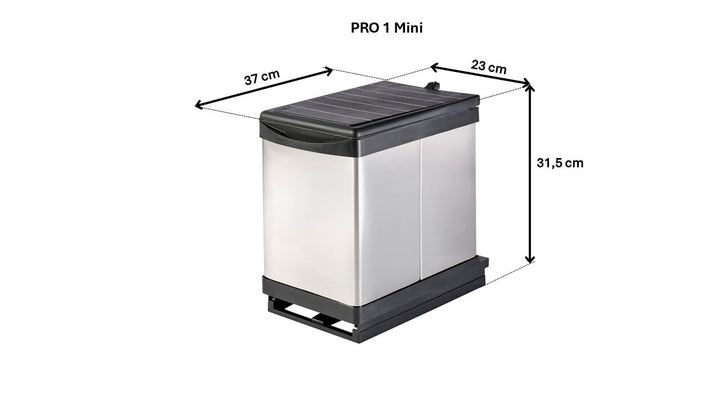 - Abfallsammler PRO 1 MINI: Masse 37 x 23 x 36 cm (L x B x H), Müllbehälter Volumen: 16l, Behälter Anzahl: 1x, mit Gleitsystem