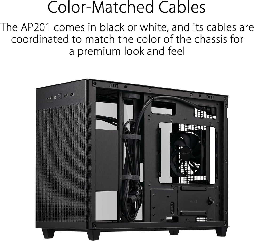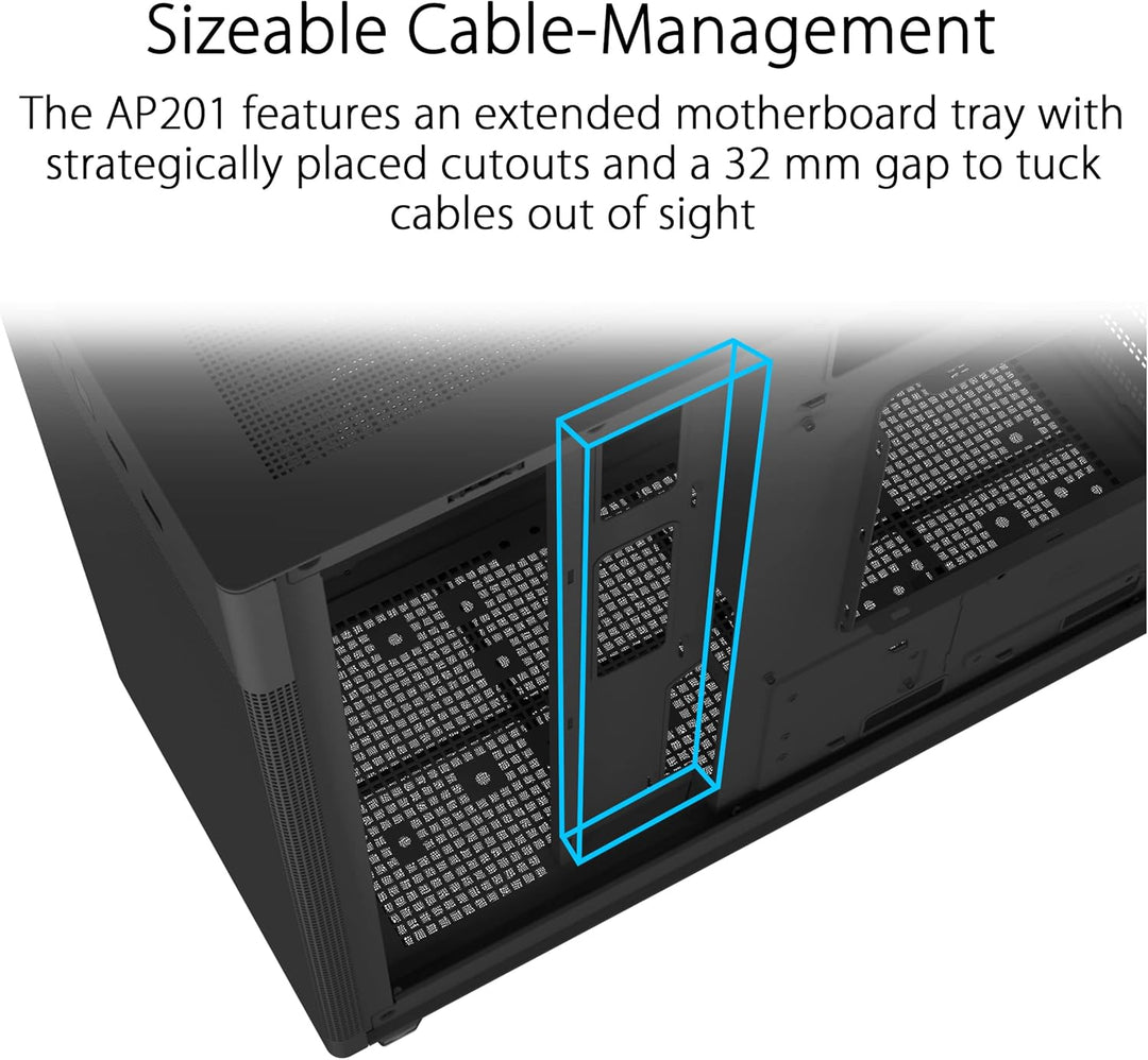 • Umfangreiches Kabel-Management: Das AP201 verfügt über einen verlängerten Mainboard-Tray mit strategisch platzierten Aussparungen und einer 32 mm grossen Lücke, um Kabel ausser Sichtweite zu bringen