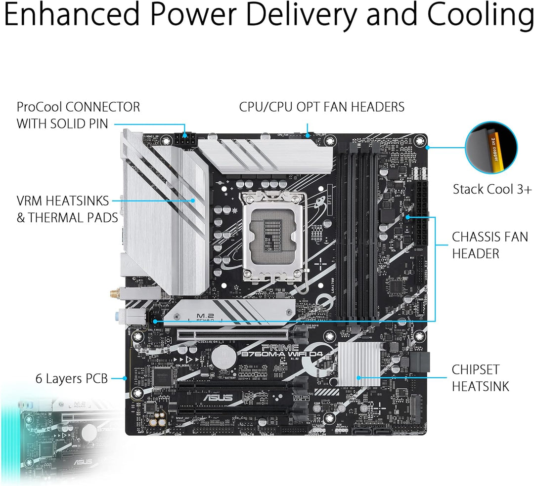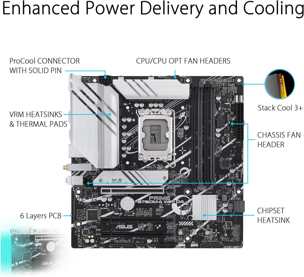 - Umfassende Kühlung: VRM-Kühlkörper, M.2-Kühlkörper, PCH-Kühlkörper, Hybridlüfter-Header und Fan Xpert 2+