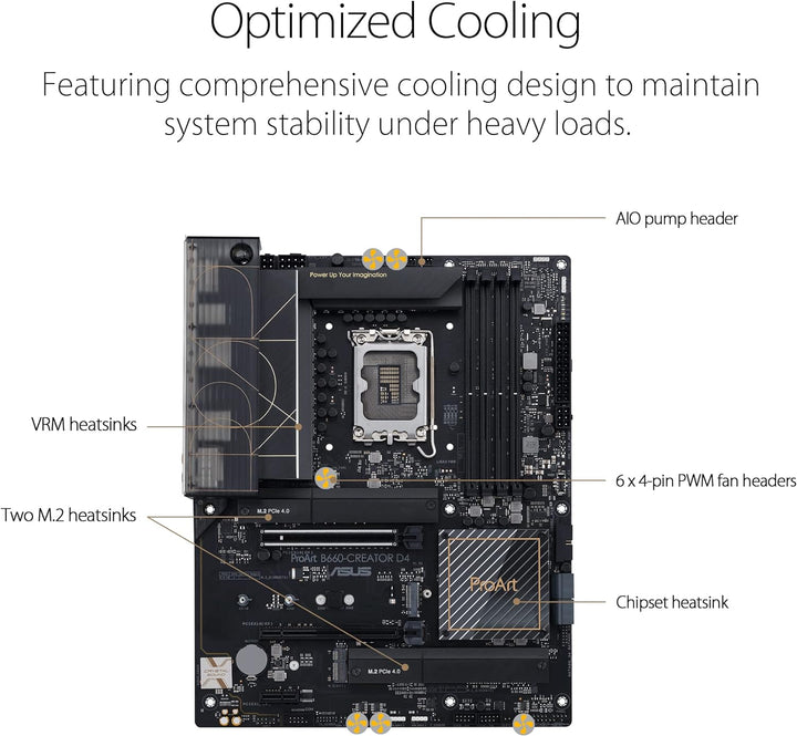 • Optimiertes thermisches Design: Ein massiver VRM- und Chipsatz-Kühlkörper, M.2-Kühlkörper aus Aluminium, sechs 4-polige PWM-Lüfteranschlüsse und ein AIO-Pumpenanschluss