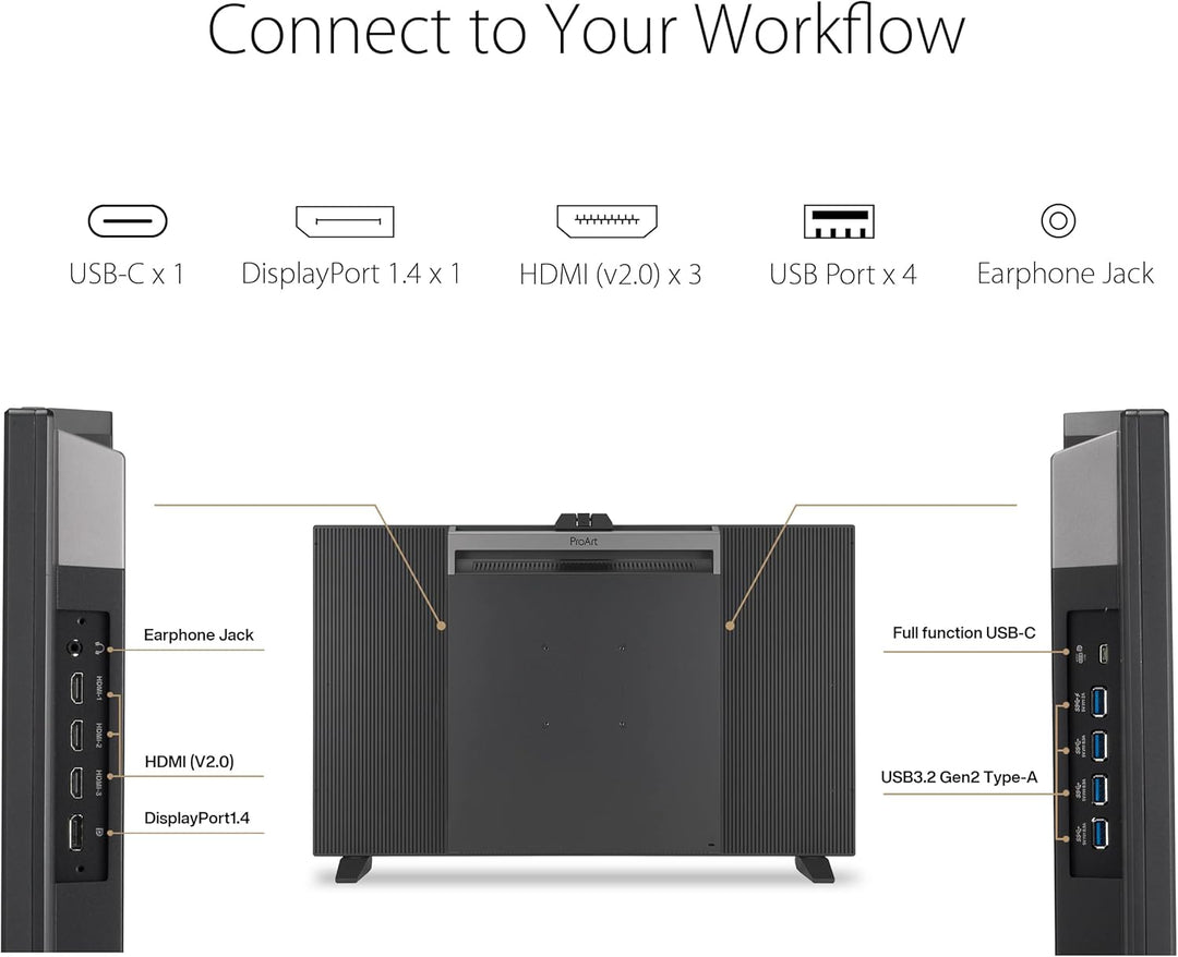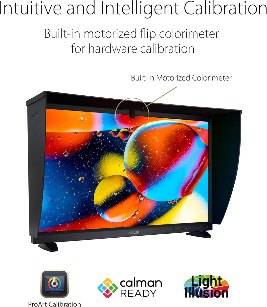 - Eingebautes Farbmessgerät und ASUS Auto Calibration ergänzen die ASUS ProArt Calibration Software sowie die professionelle Hardware-Kalibrierungssoftware Calman und Light Illusion ColourSpace CMS