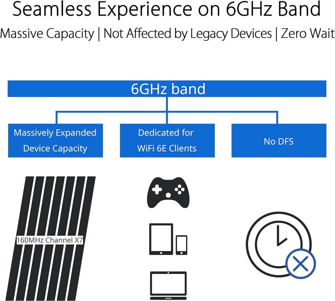 - Neues 6-GHz-Frequenzband – Breitere Kanäle und höhere Kapazität sorgen für höhere Leistung, geringere Latenzzeiten und weniger Interferenzen